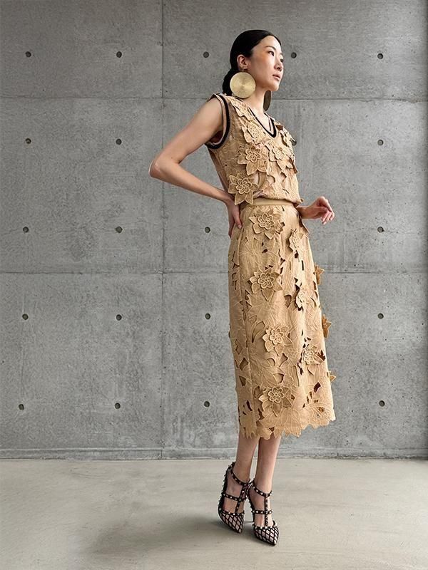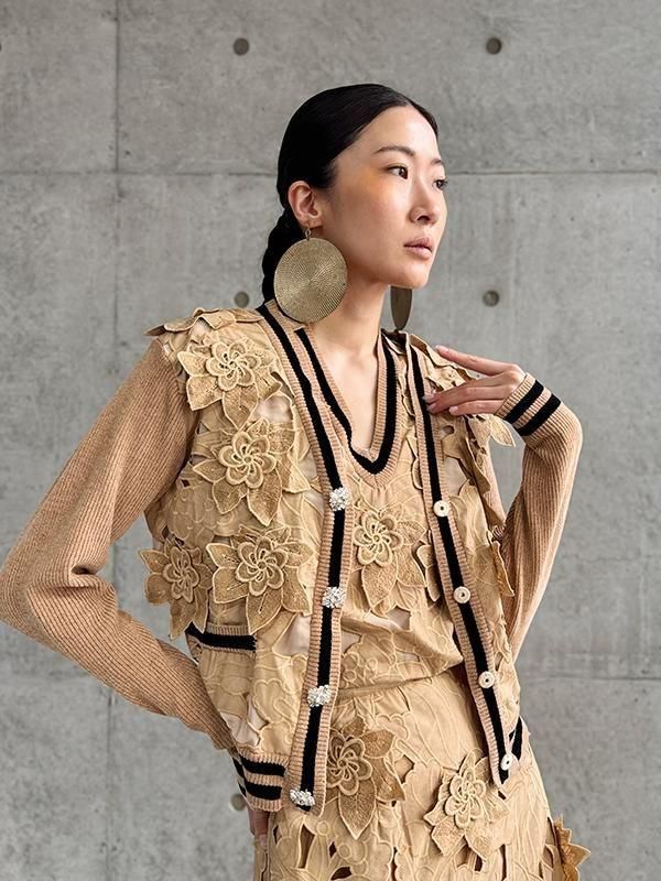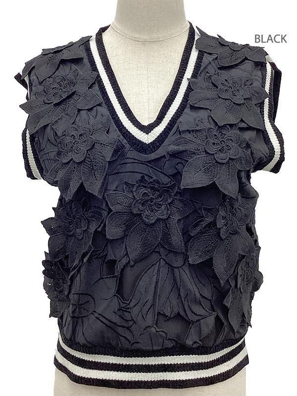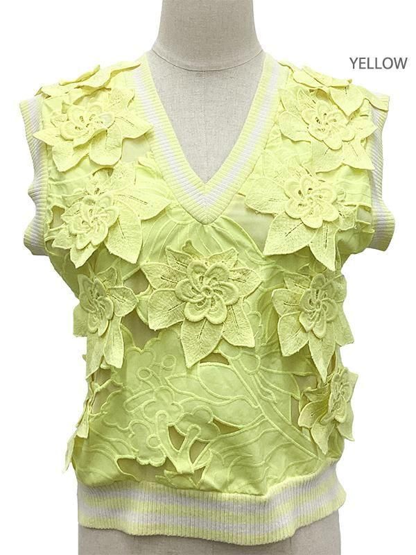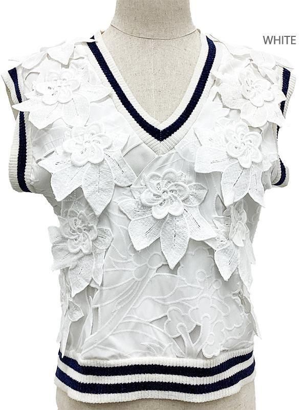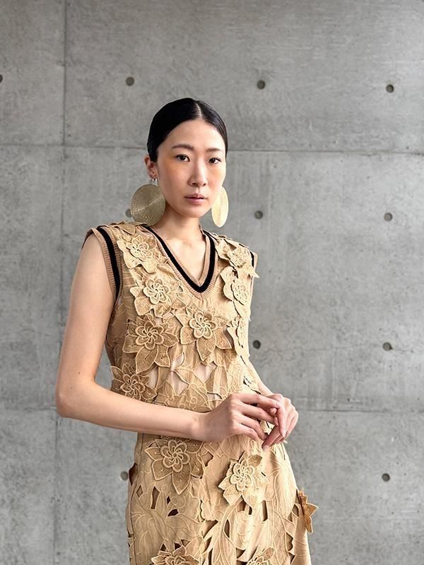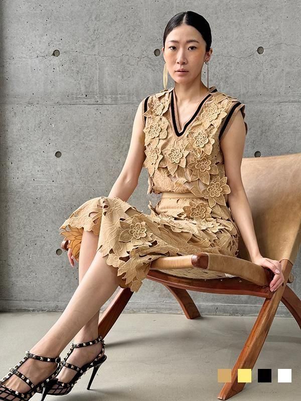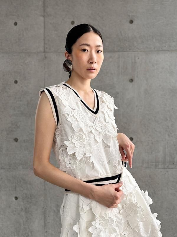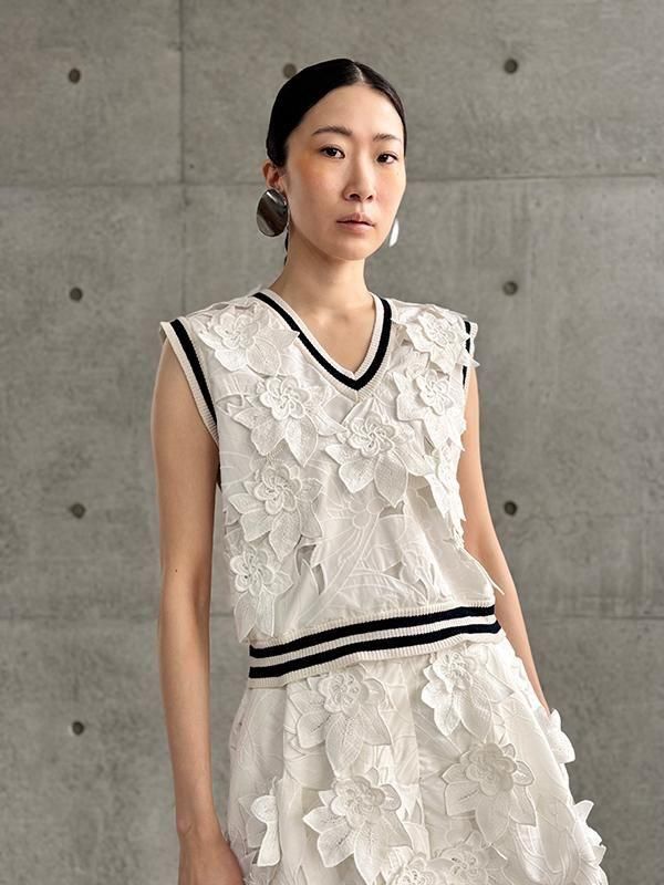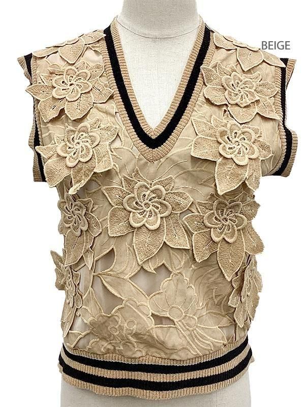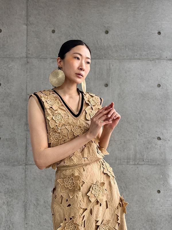 立体的な大ぶりのフラワーレースモチーフが女性らしい印象のノースリーブニットです。