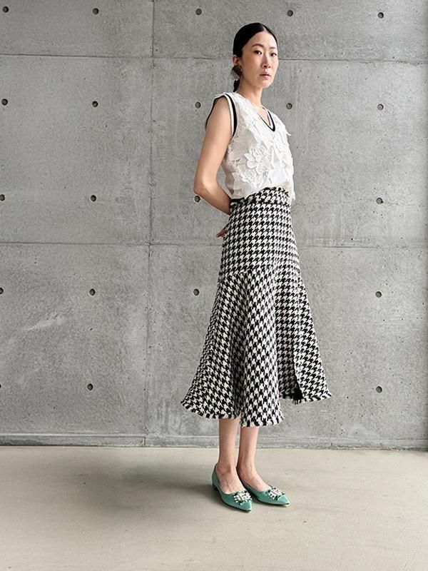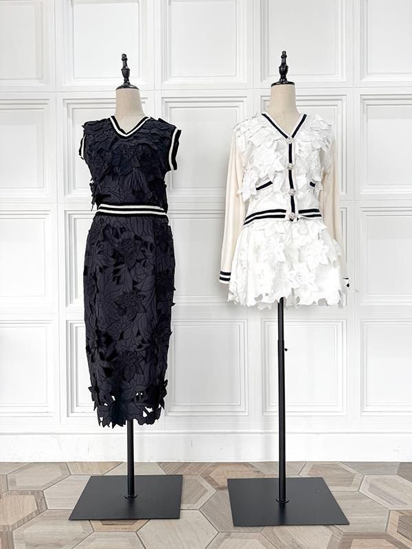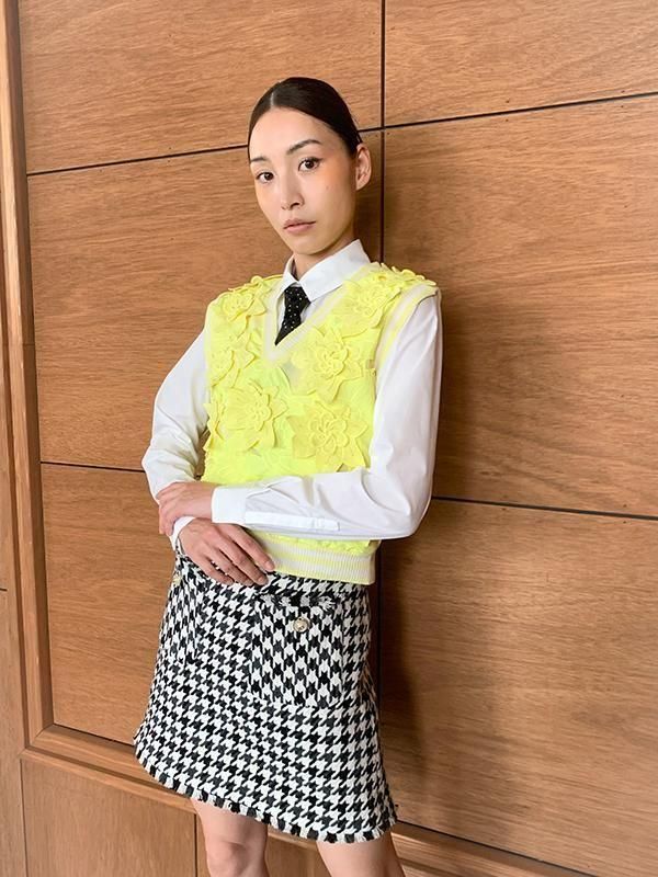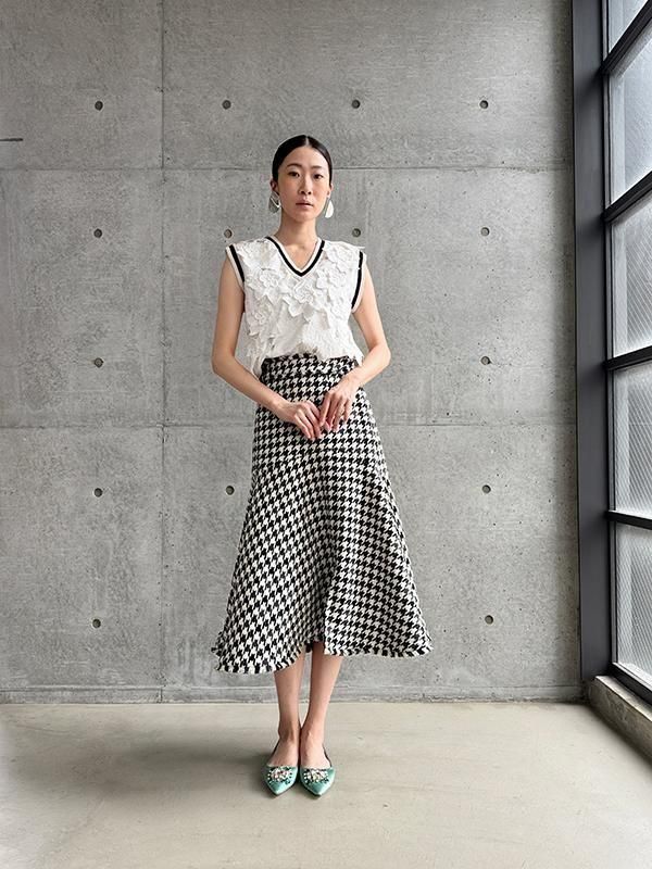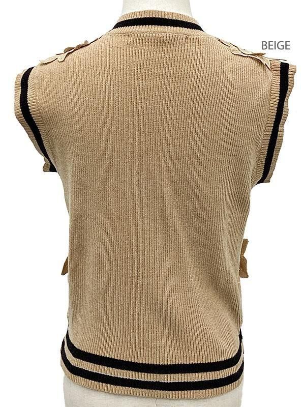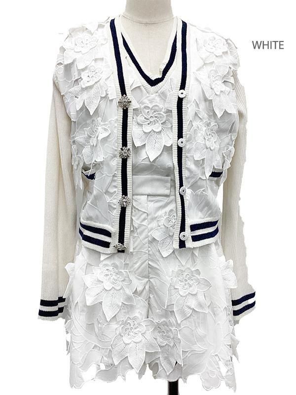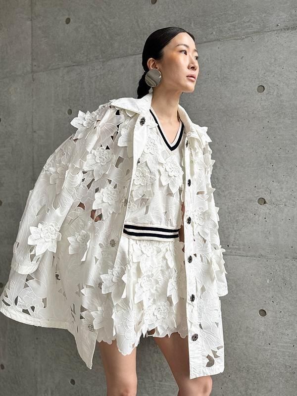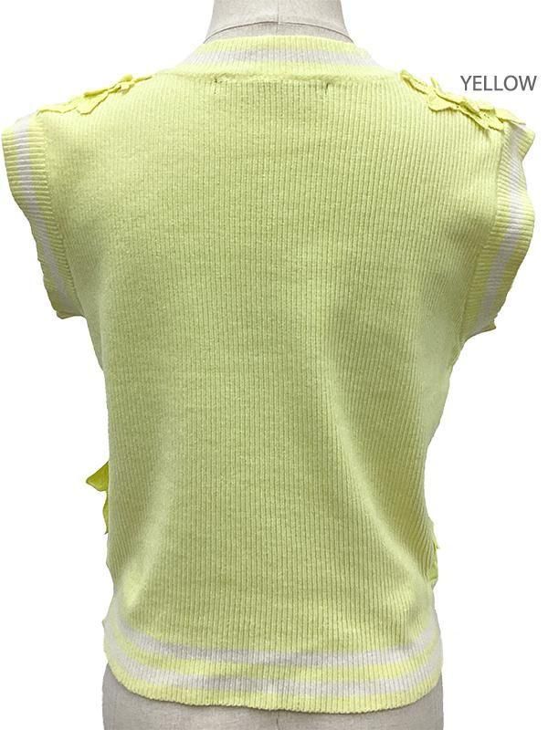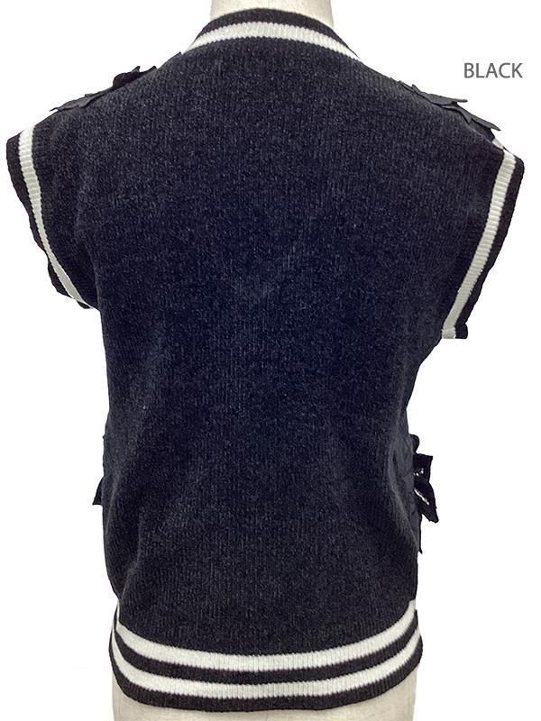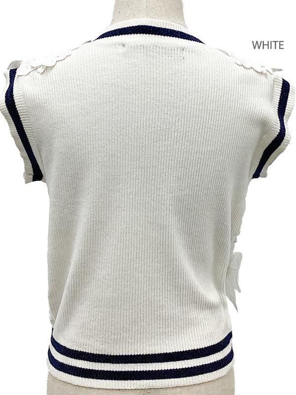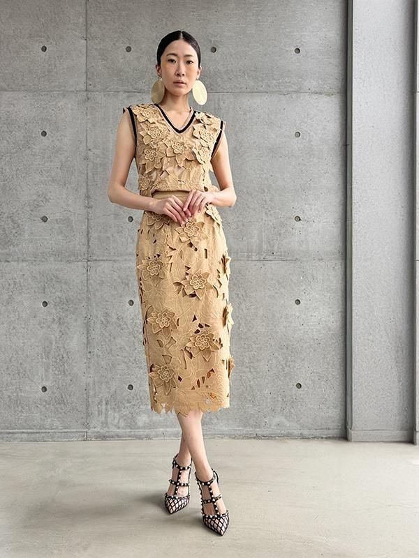 立体的な大ぶりのフラワーレースモチーフが女性らしい印象のノースリーブニットです。
