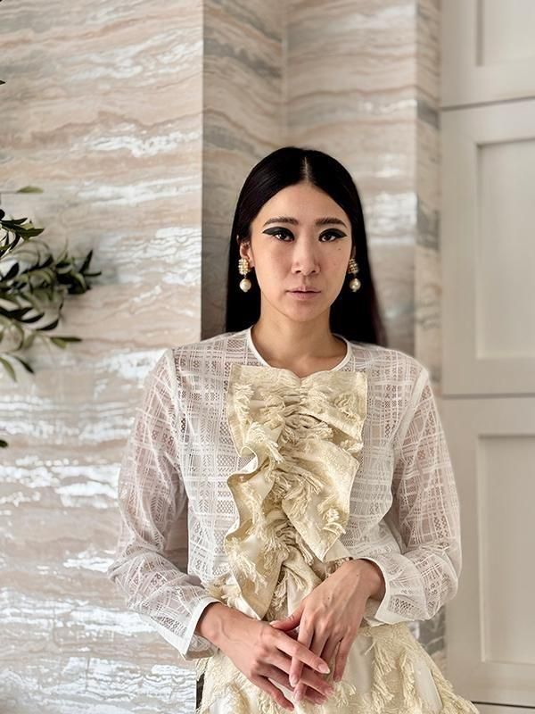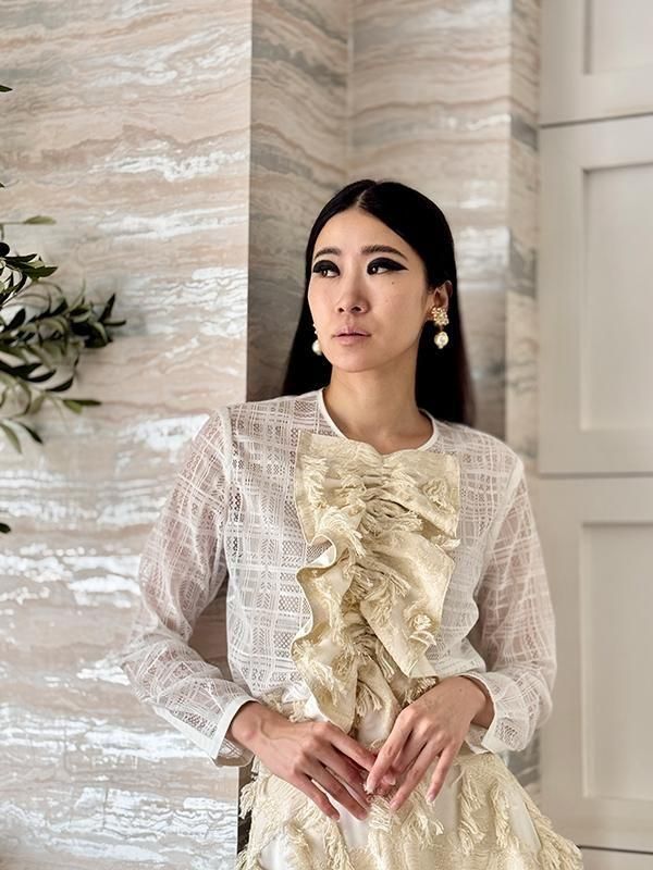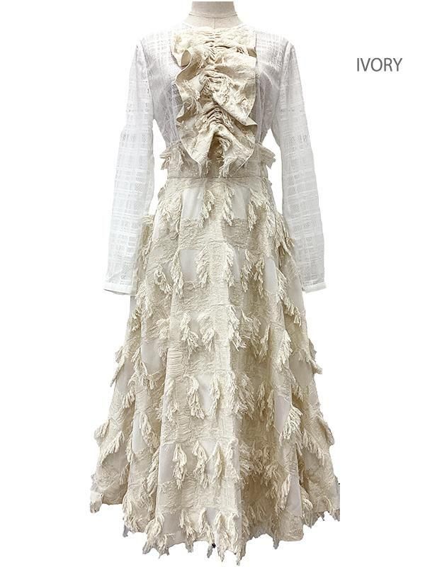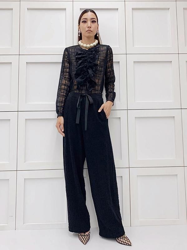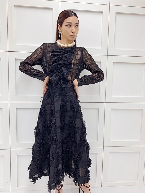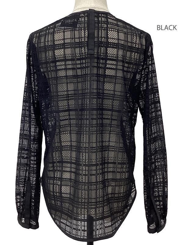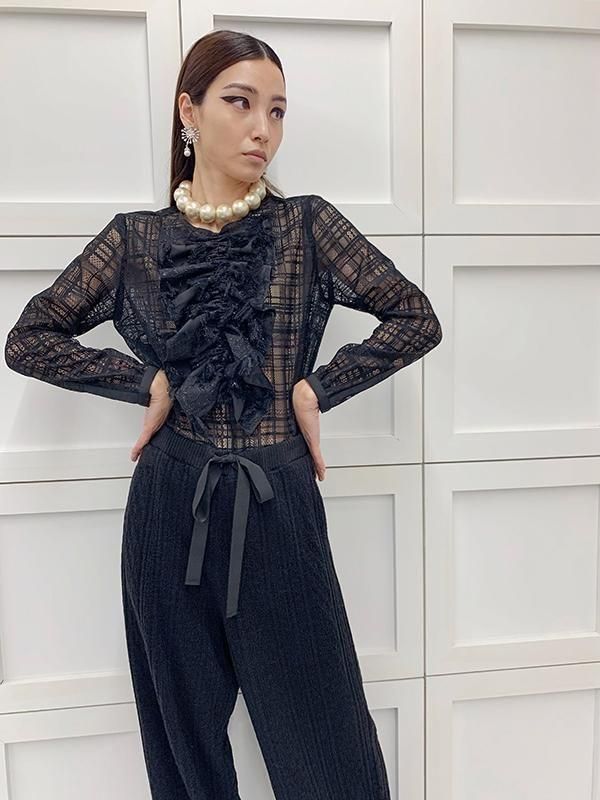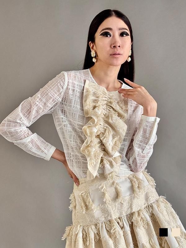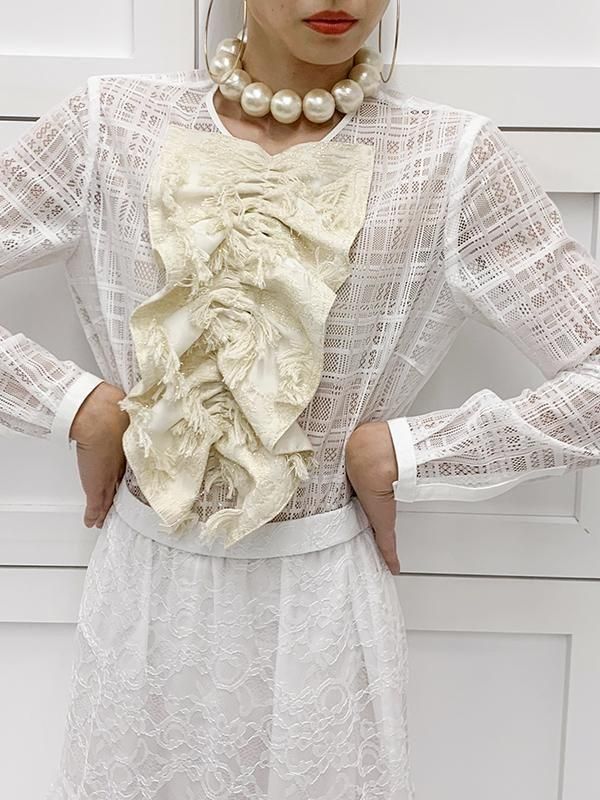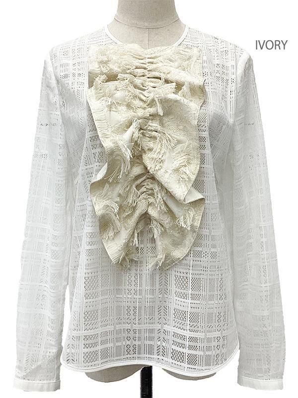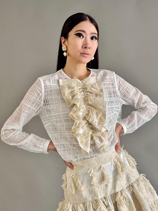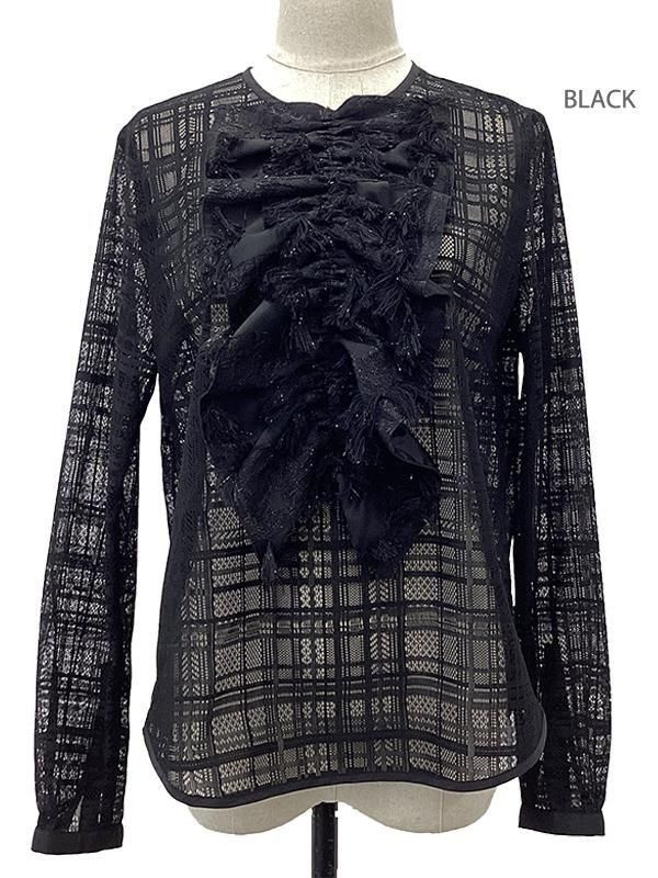 ノーブルな印象のチェック柄レースに、 ラメのきらきら感とフリンジの効いたフリルを施したブラウスです。