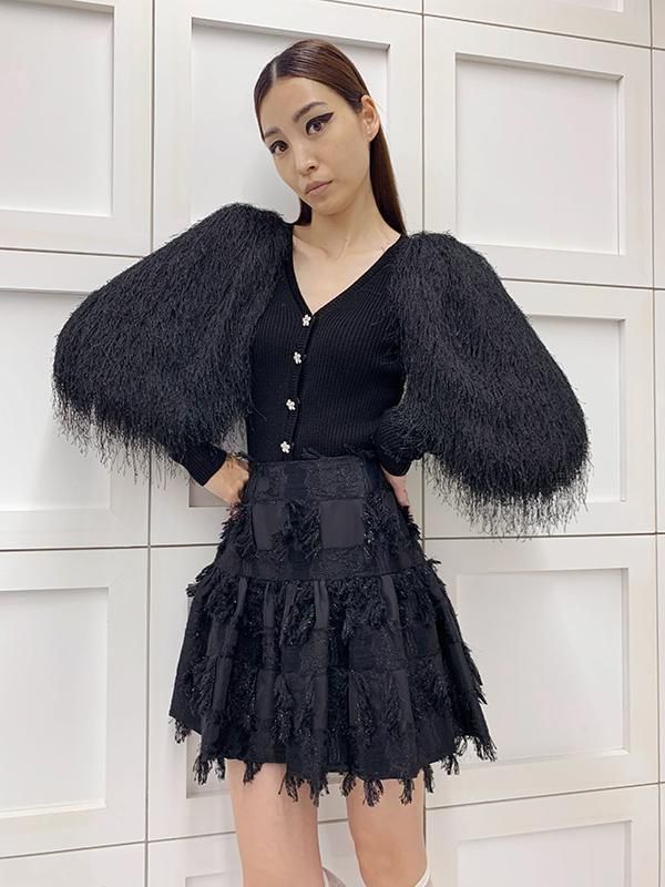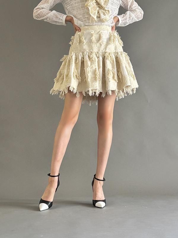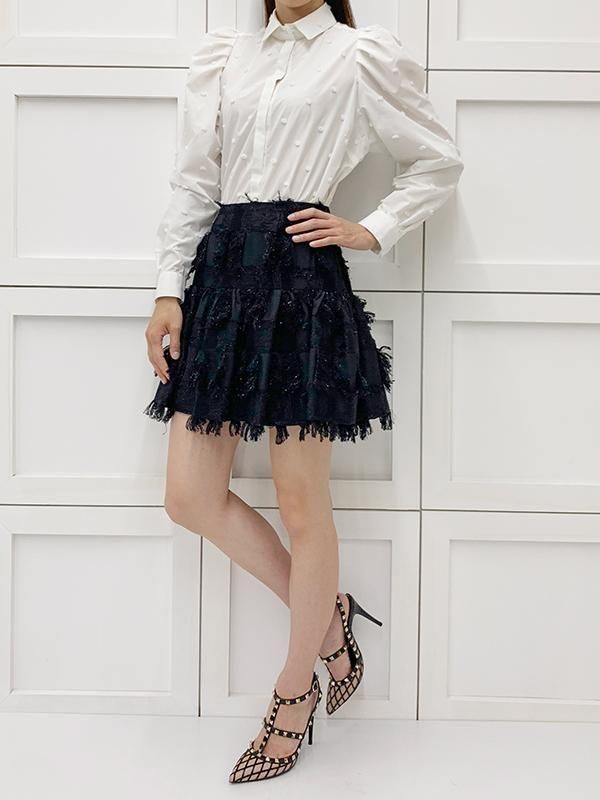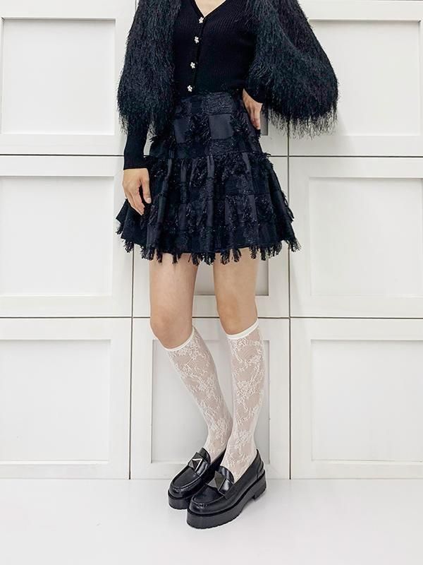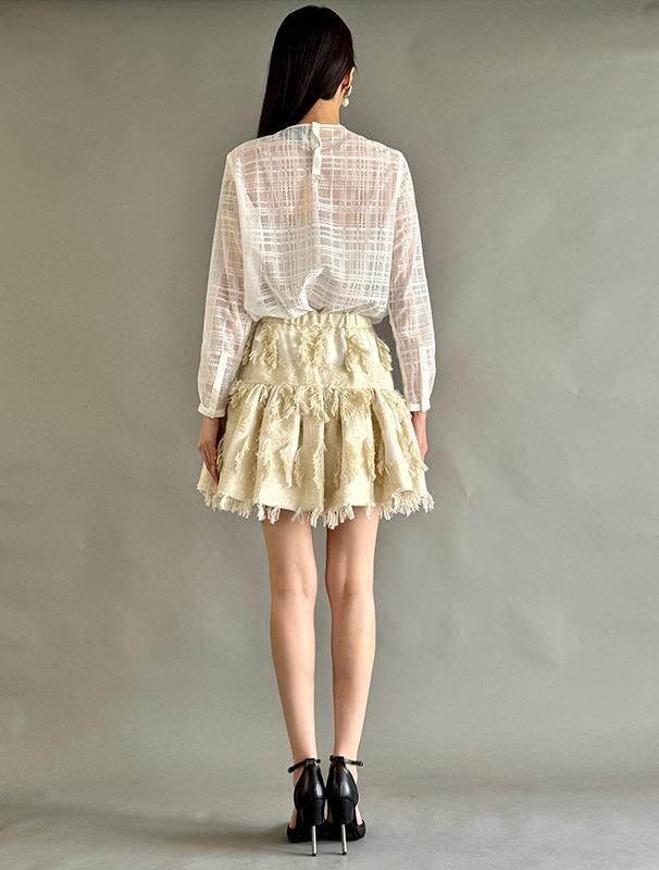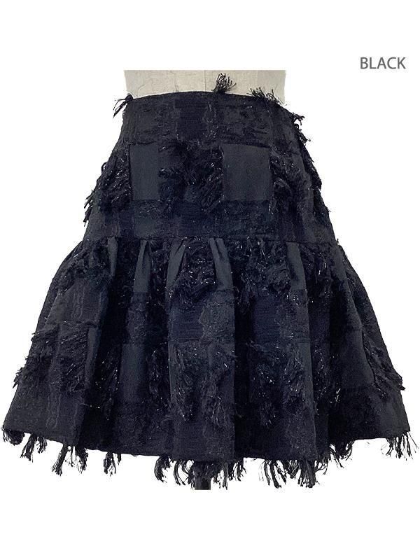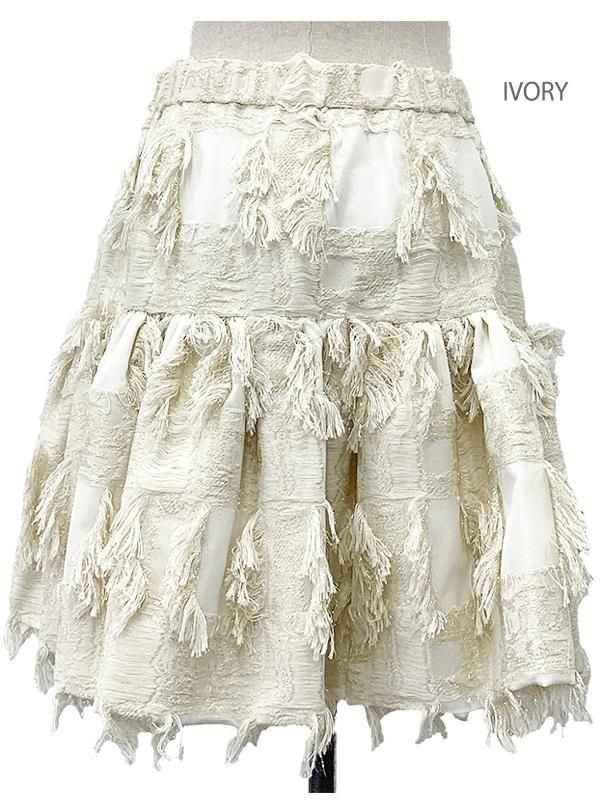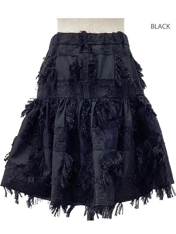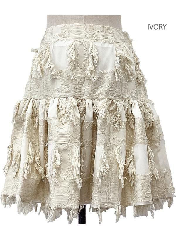 トレンド感ある大き目のクロスチェックに、 ラメのきらきら感とフリンジのバランスが絶妙のフレアミニスカートです。