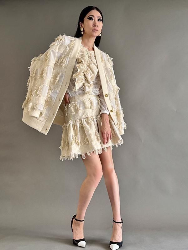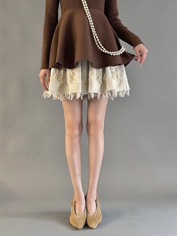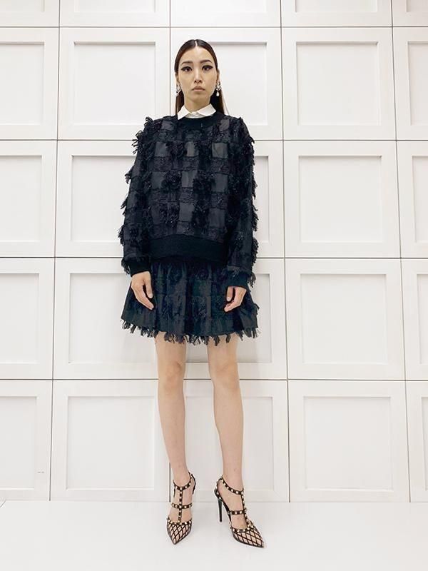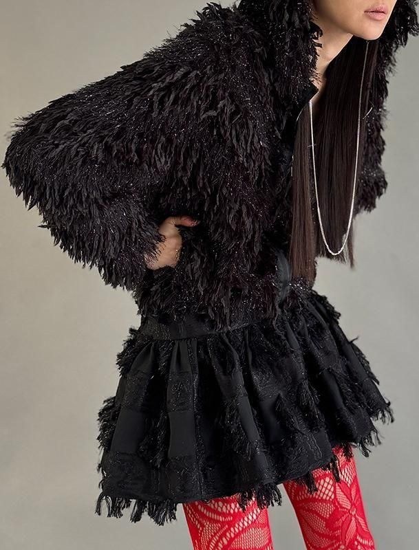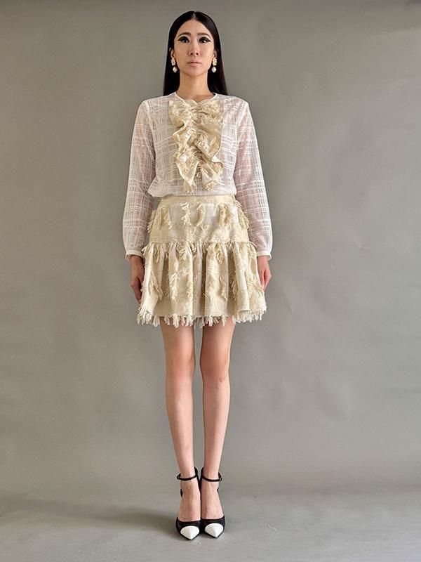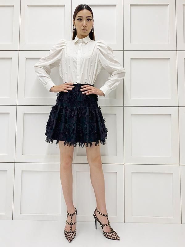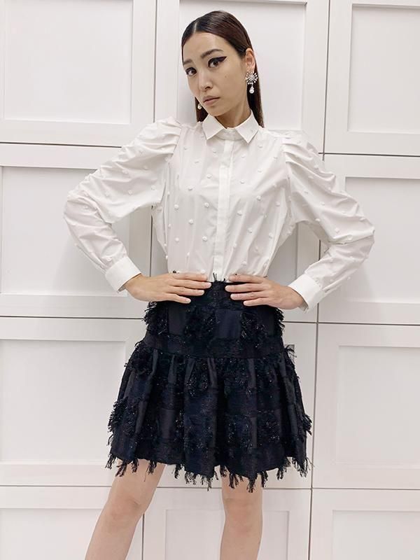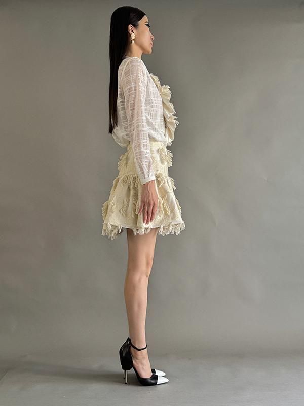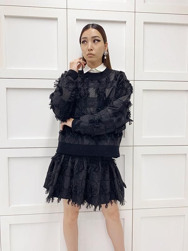 トレンド感ある大き目のクロスチェックに、 ラメのきらきら感とフリンジのバランスが絶妙のフレアミニスカートです。