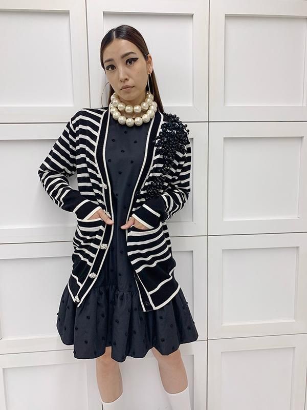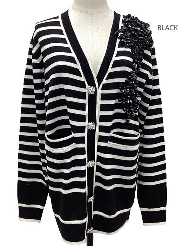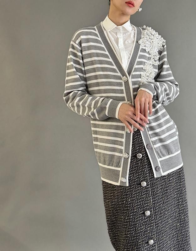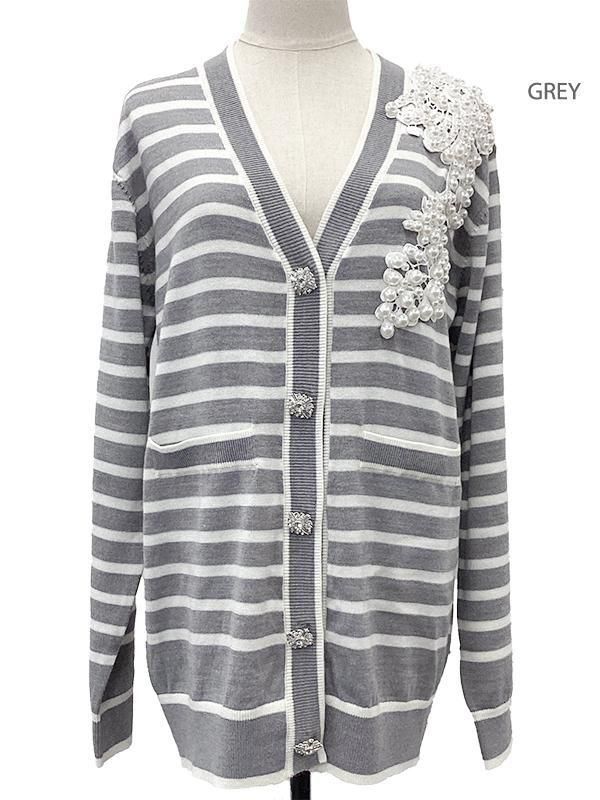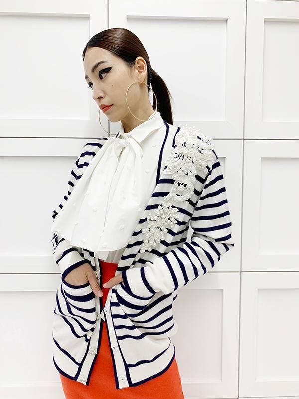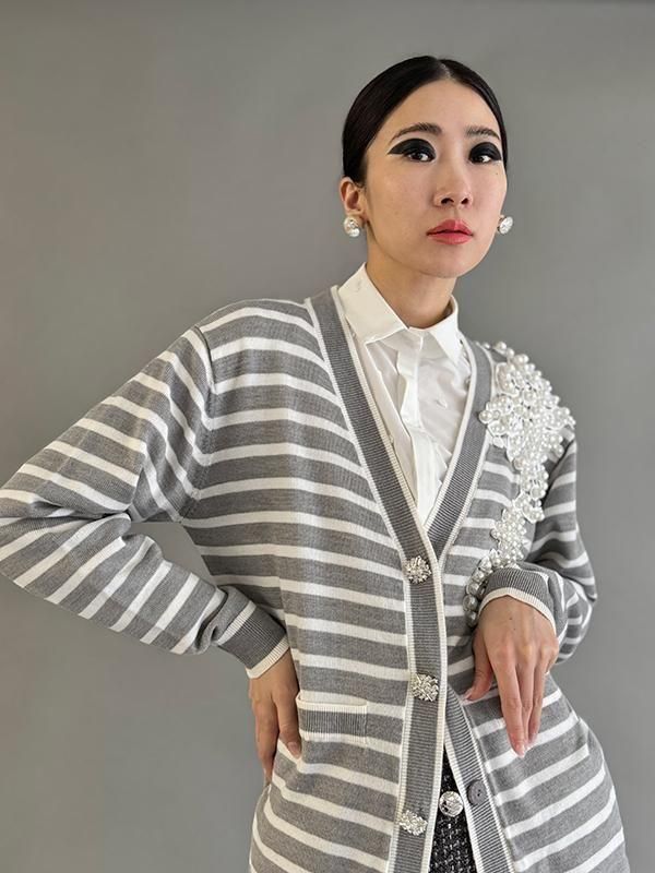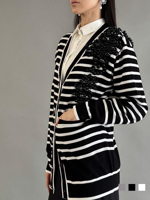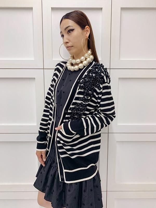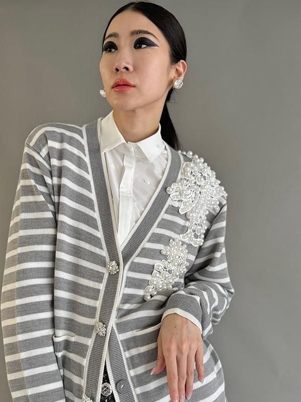 パールモチーフの刺繍が、顔周りを華やかに彩るニットカーディガンです。