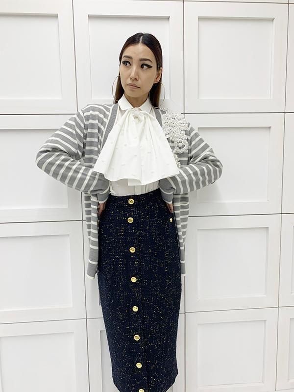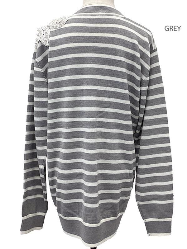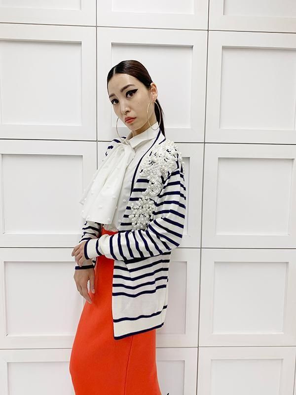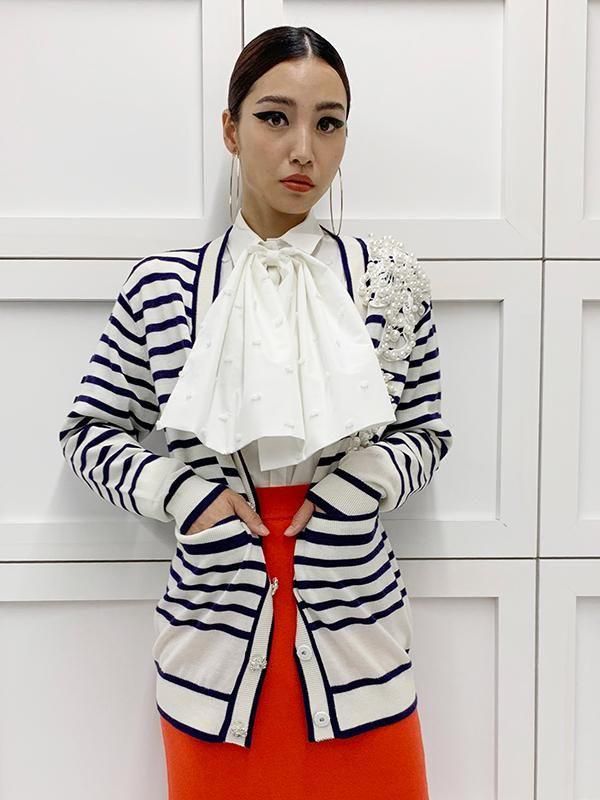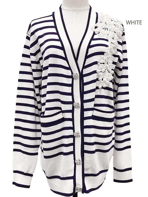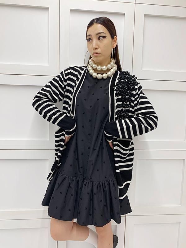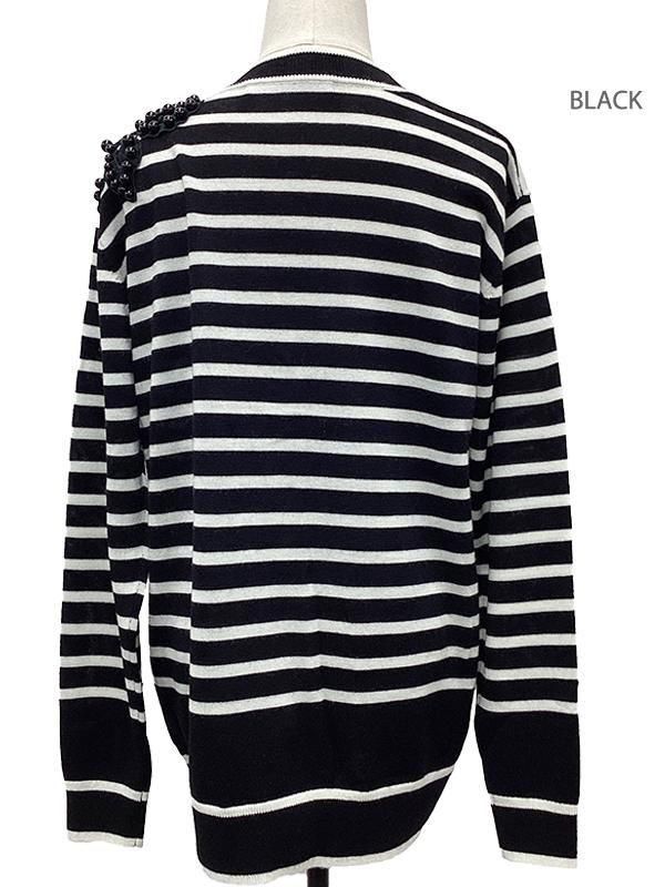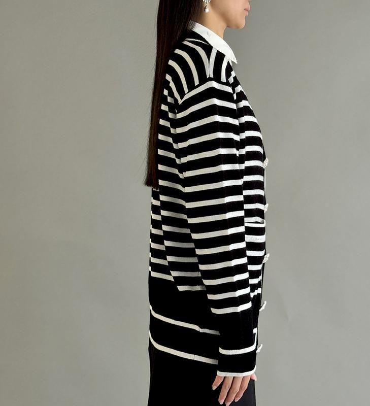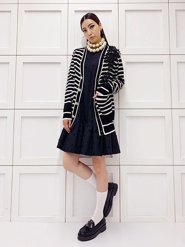 パールモチーフの刺繍が、顔周りを華やかに彩るニットカーディガンです。