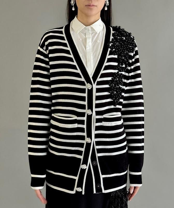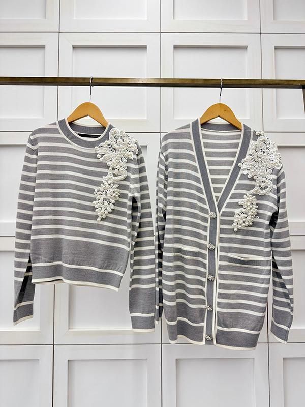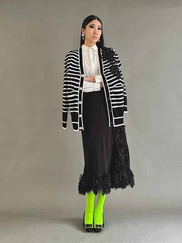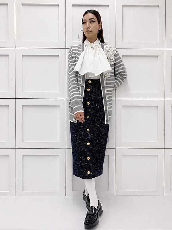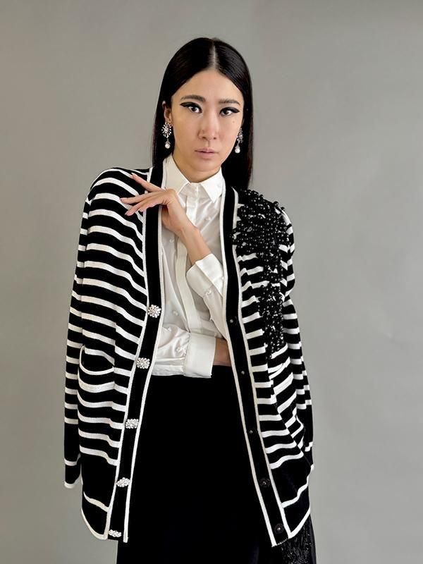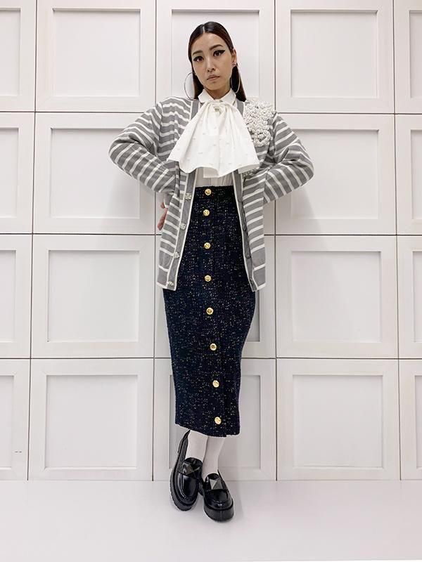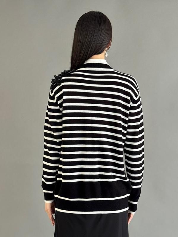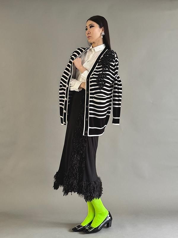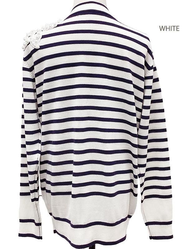 パールモチーフの刺繍が、顔周りを華やかに彩るニットカーディガンです。
