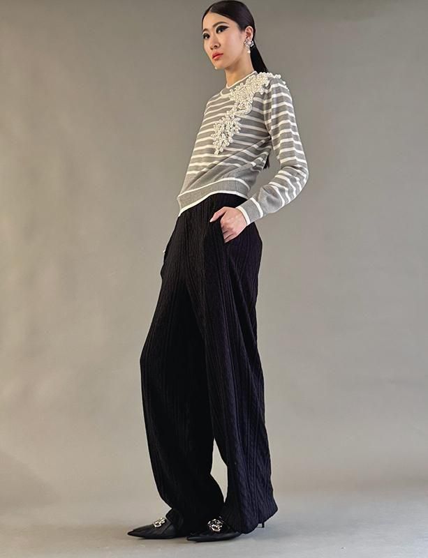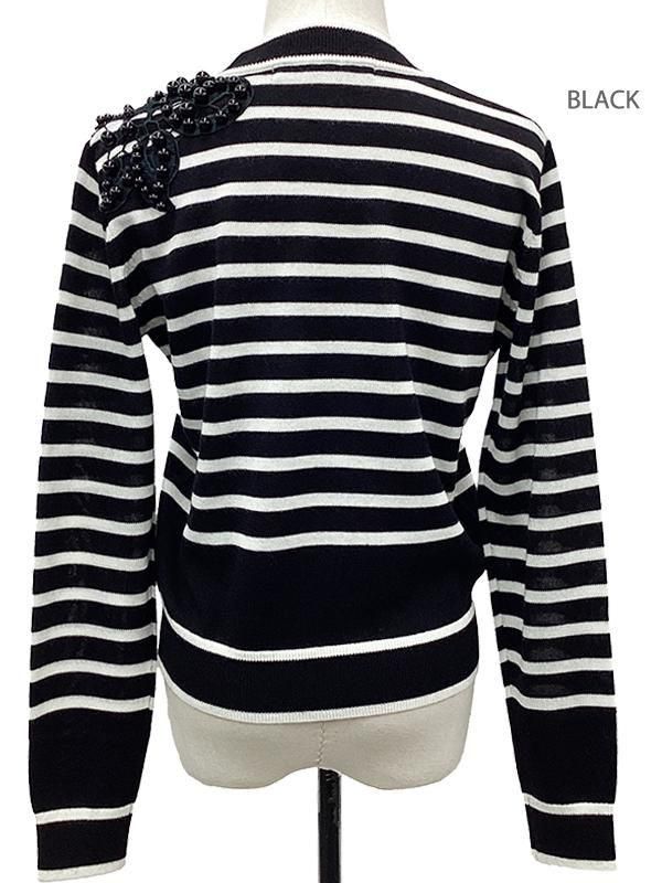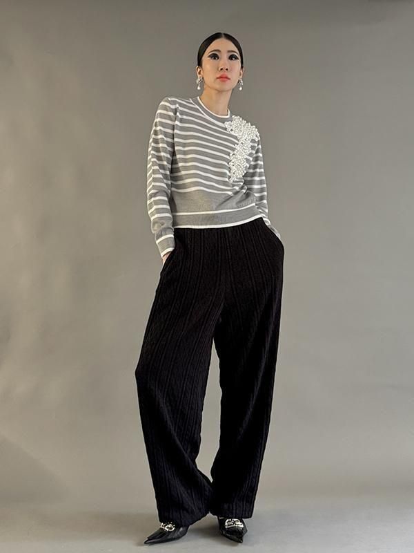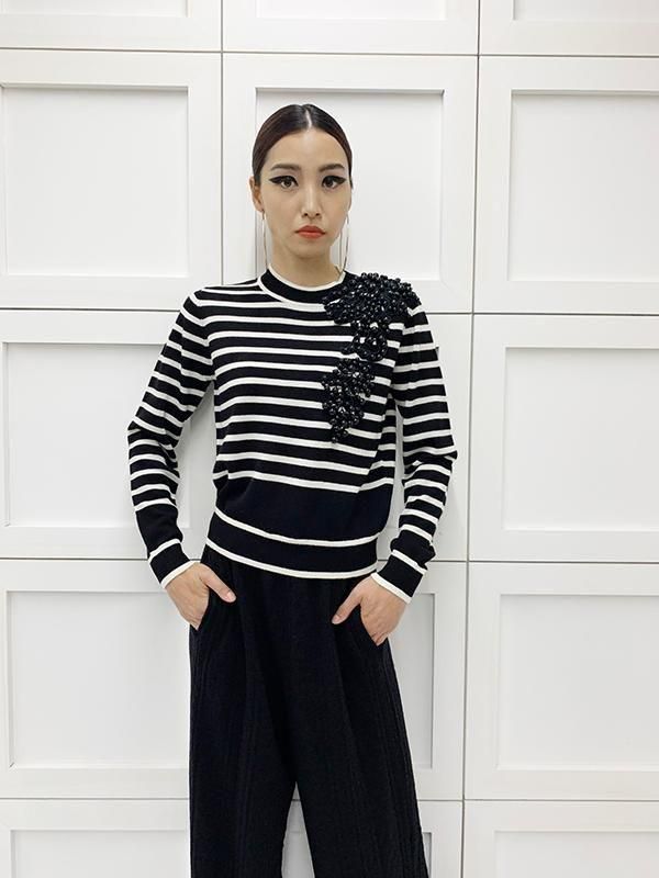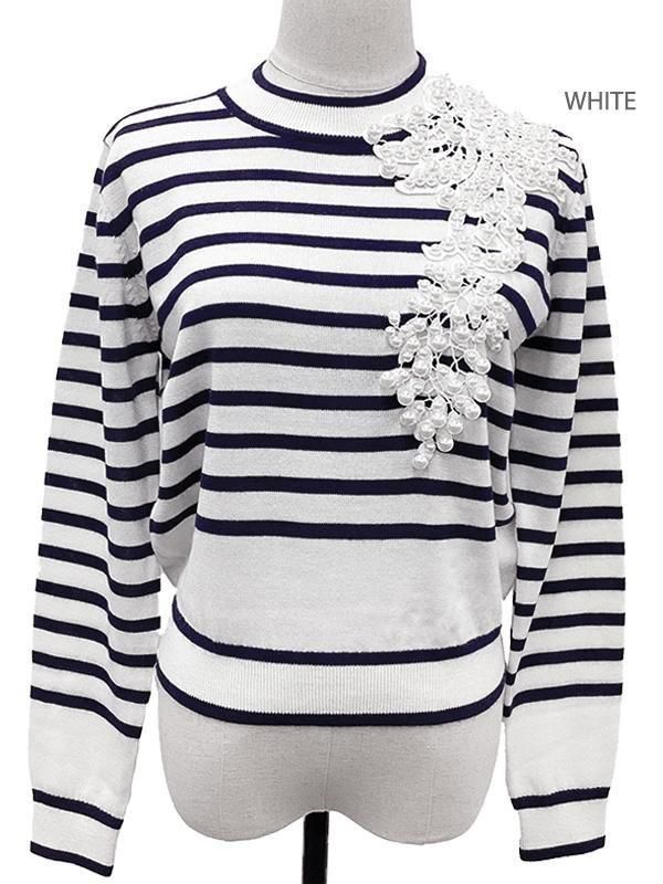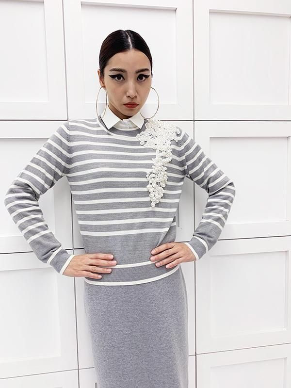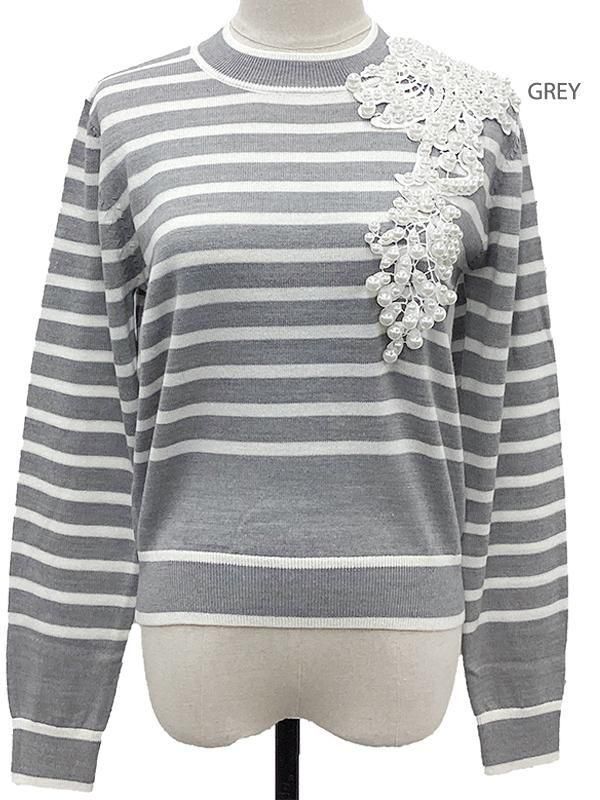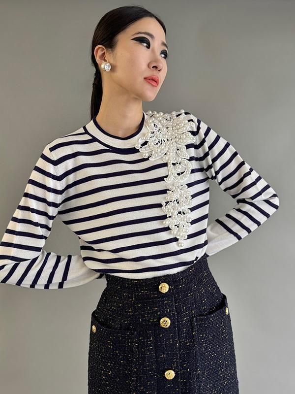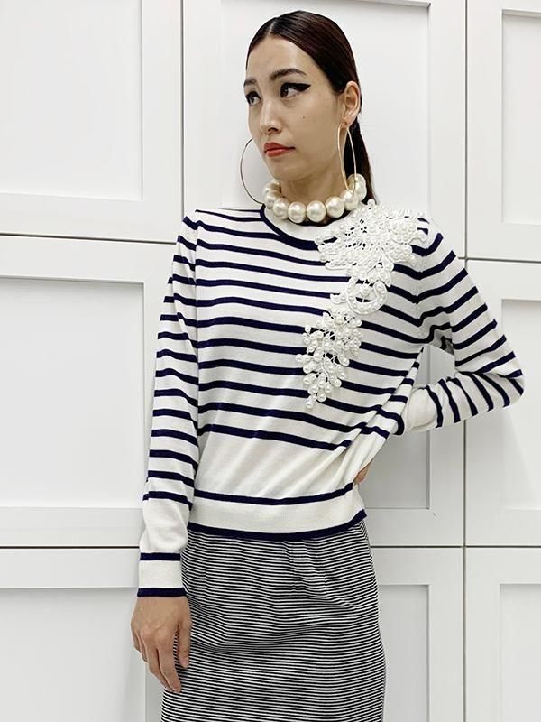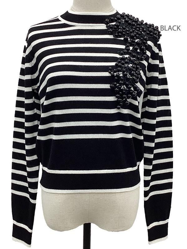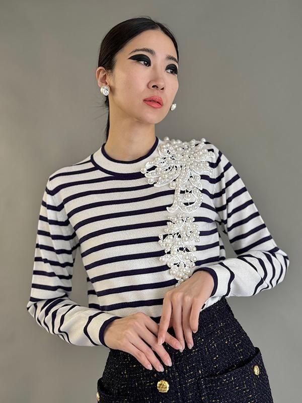 パールモチーフの刺繍が、顔周りを華やかに彩るニットプルオーバーです。