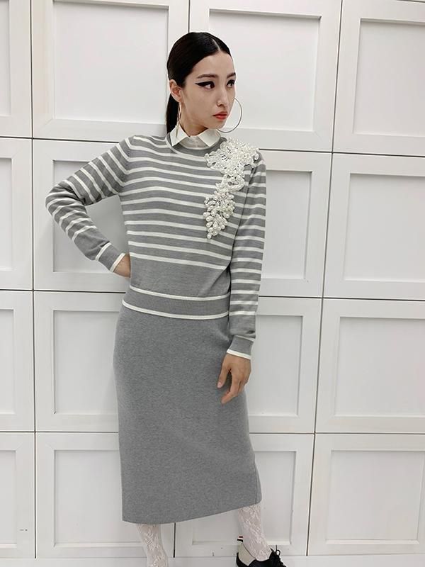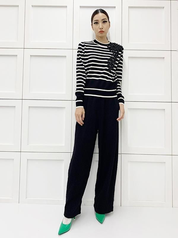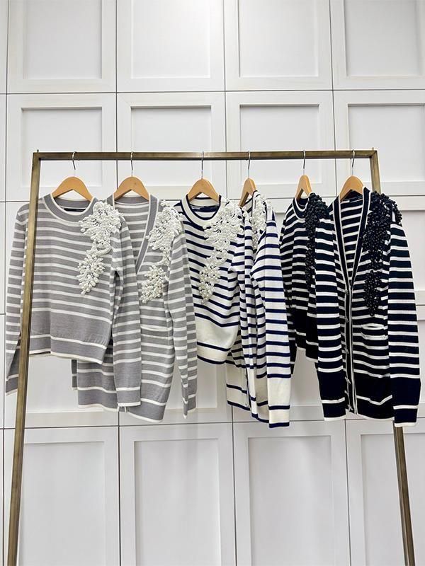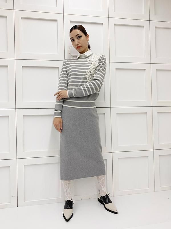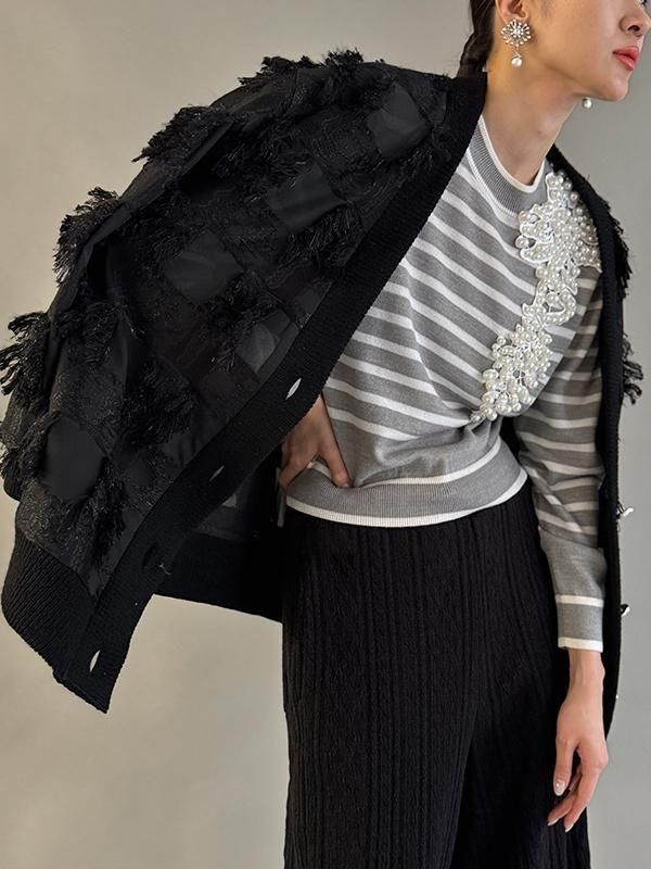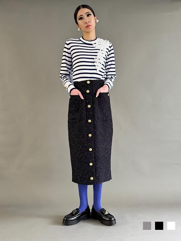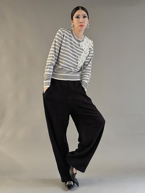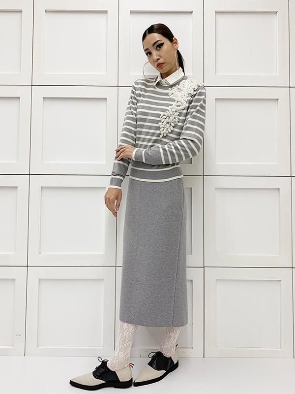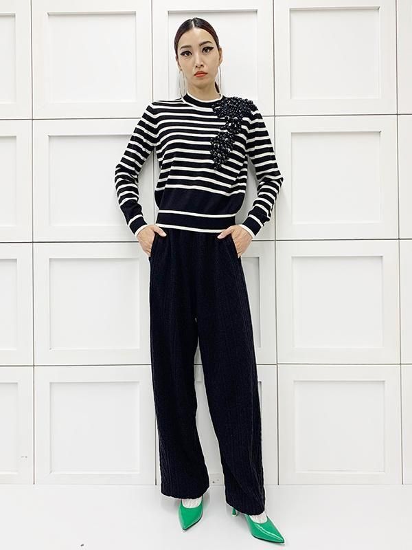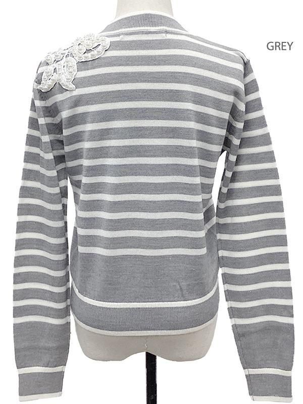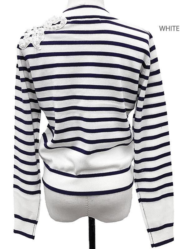 パールモチーフの刺繍が、顔周りを華やかに彩るニットプルオーバーです。