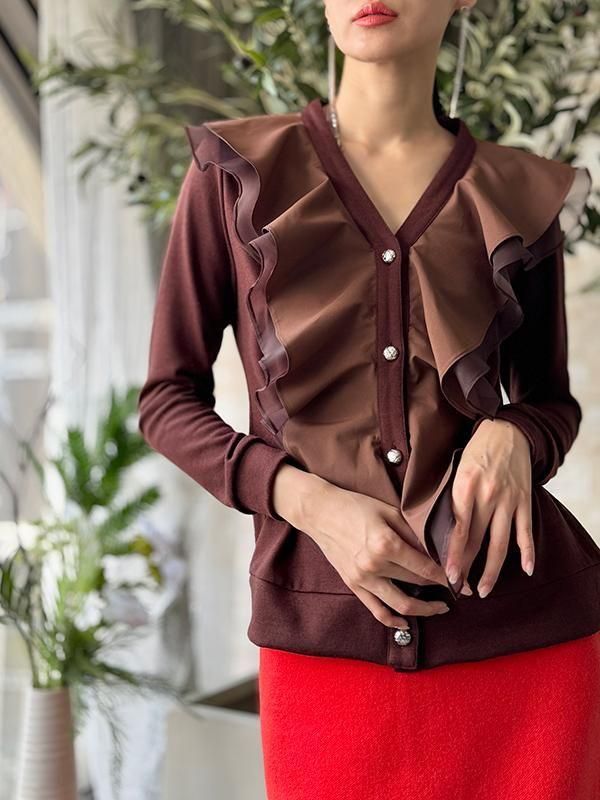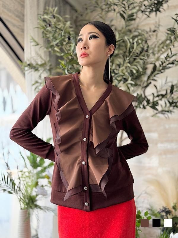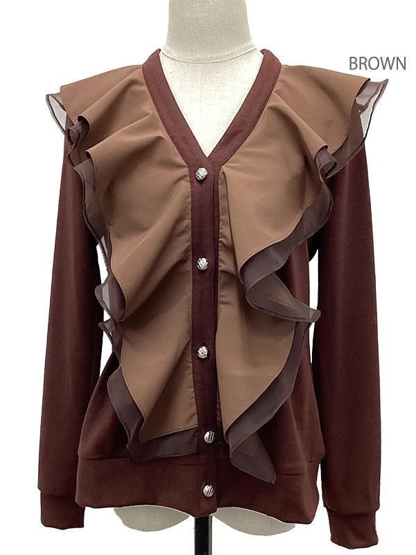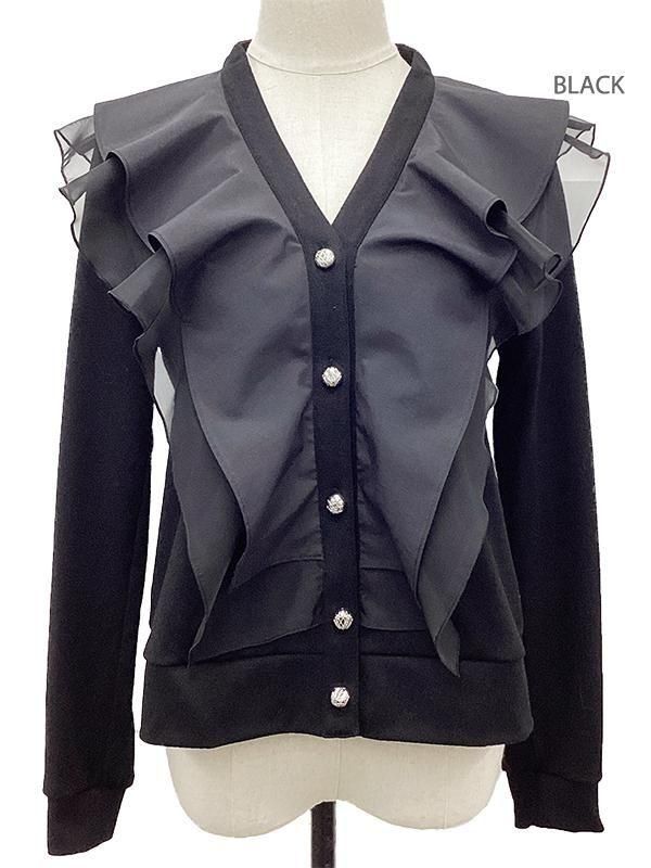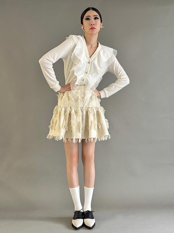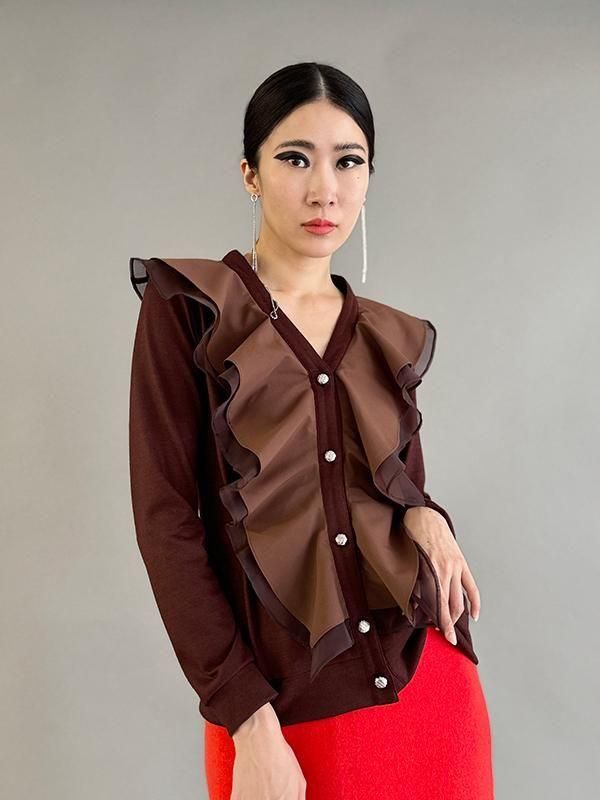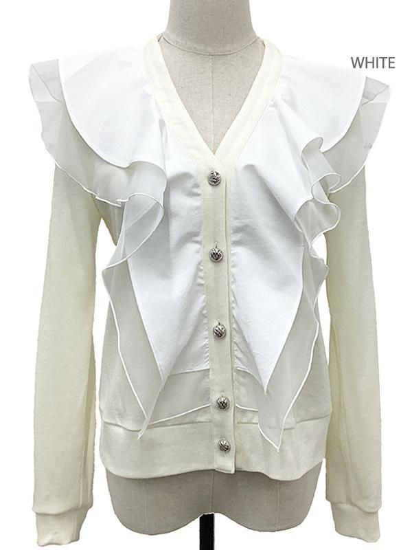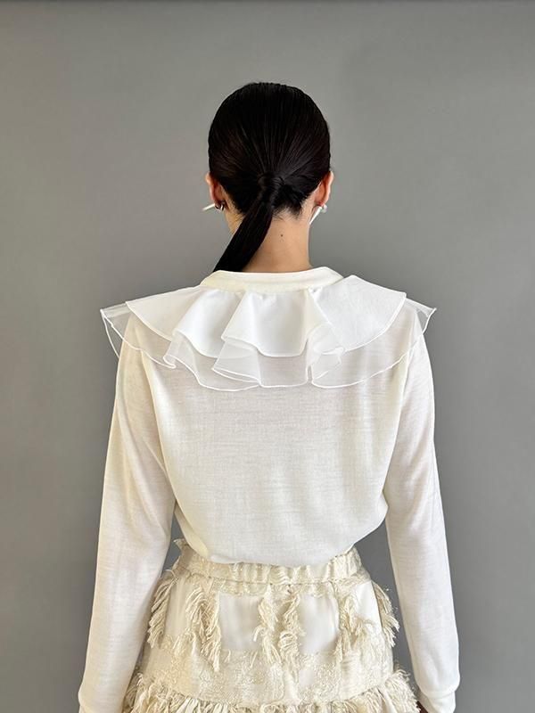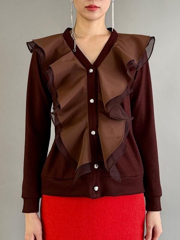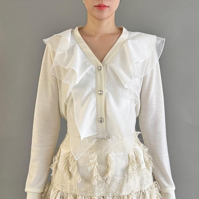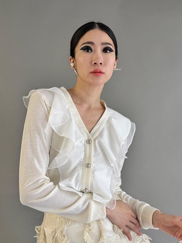 ウールを使用したオーガンジーフリルが引き立つ、Vネックのカーディガンです。