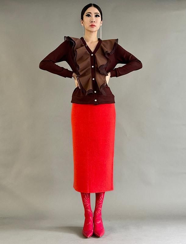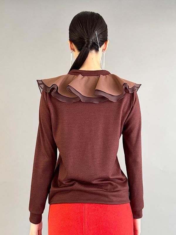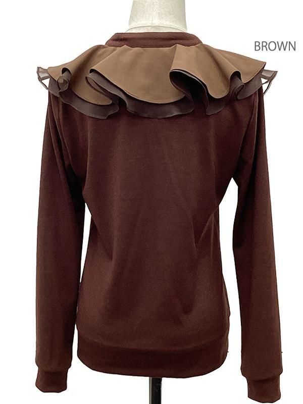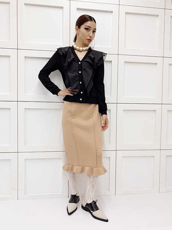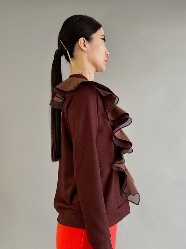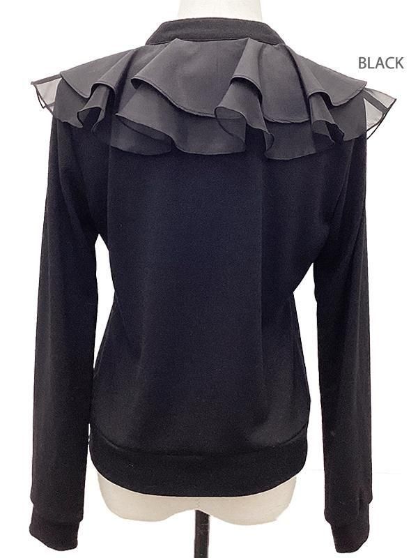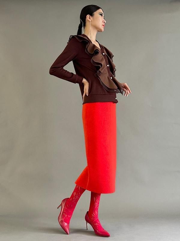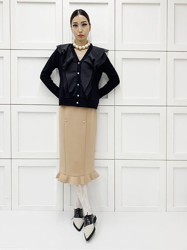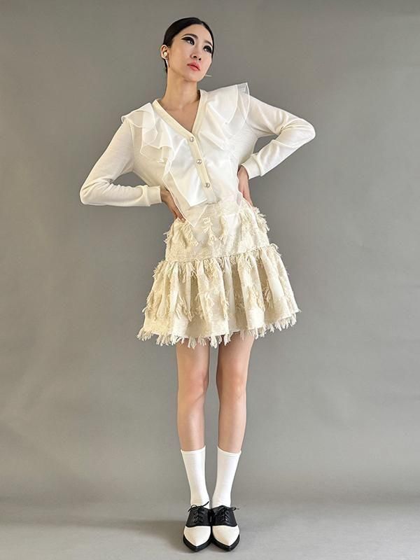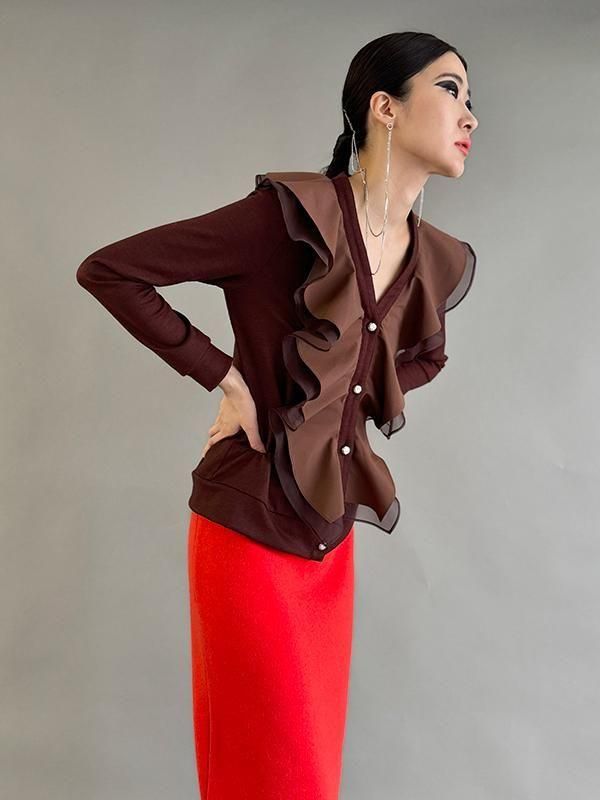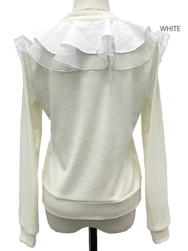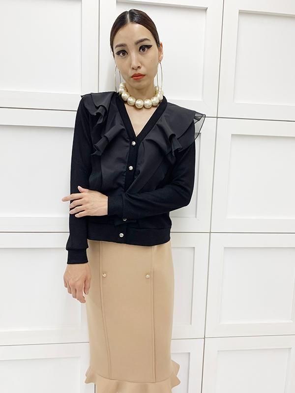 ウールを使用したオーガンジーフリルが引き立つ、Vネックのカーディガンです。