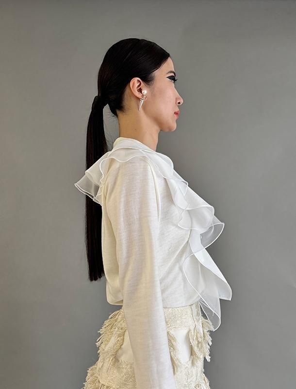 オーガンジーのフリルが華やかで、小顔効果も◎