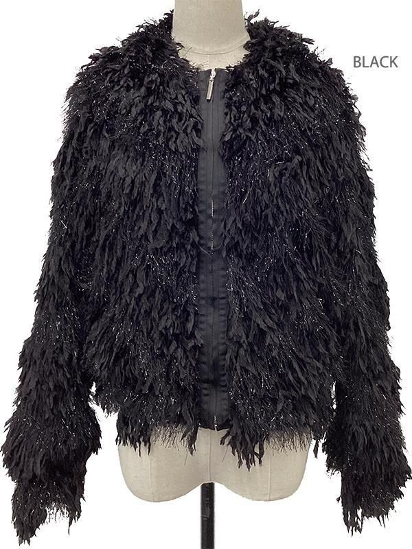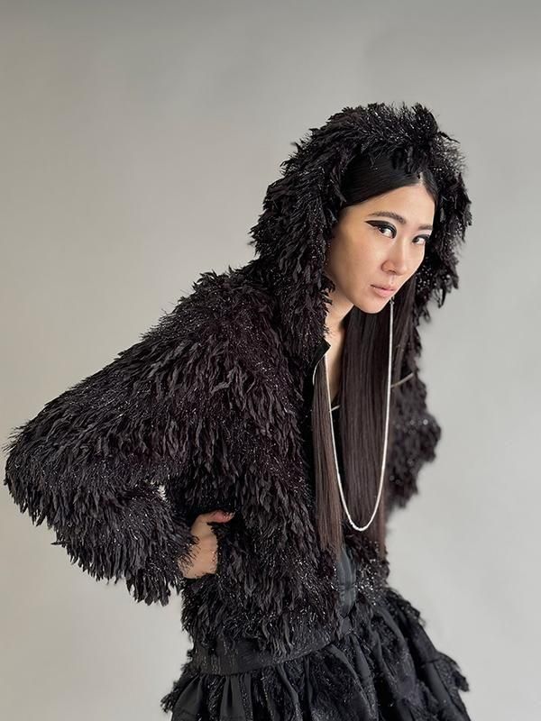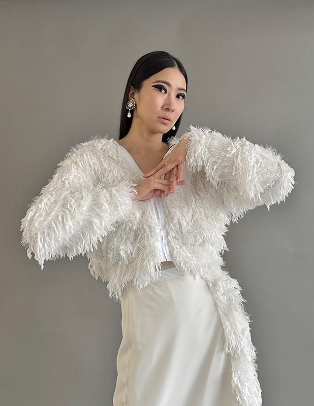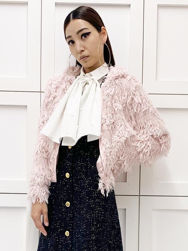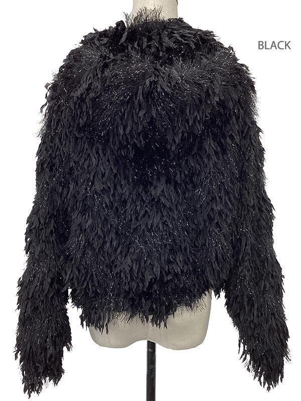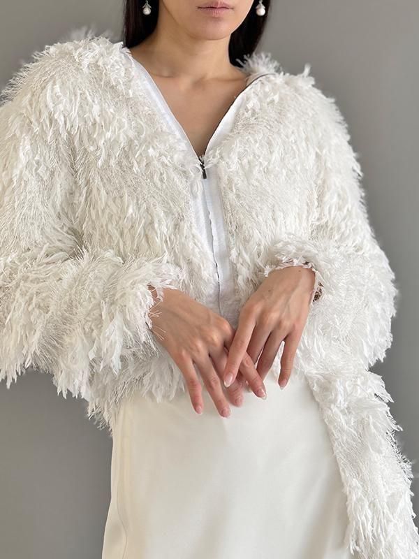フェザーとメタル、シャギーと3種類の糸を組み合わせたふんわりとした毛足が上品な甘さを演出します。