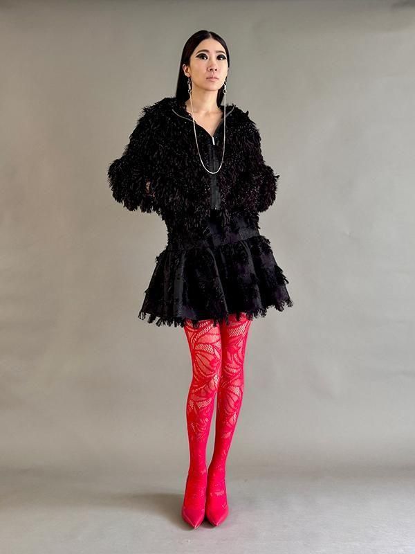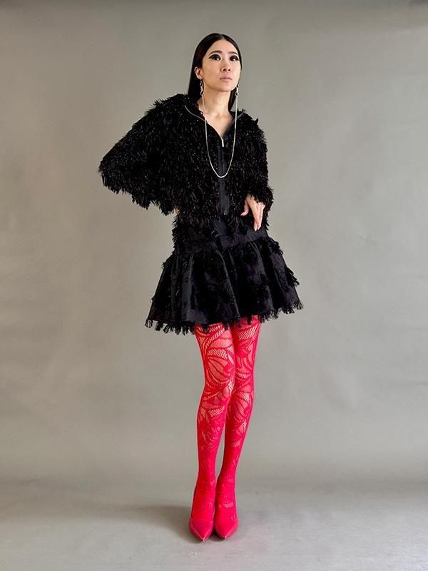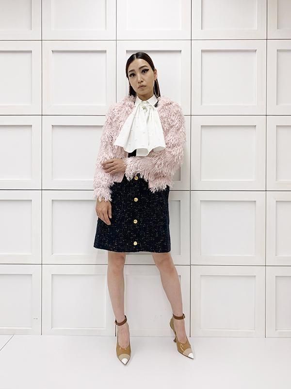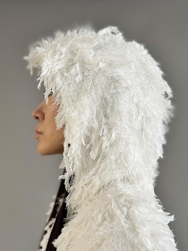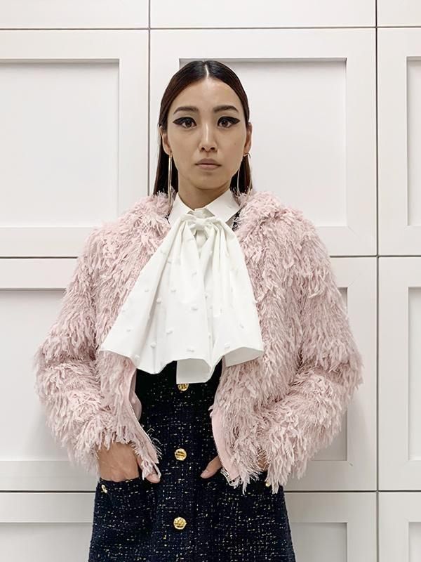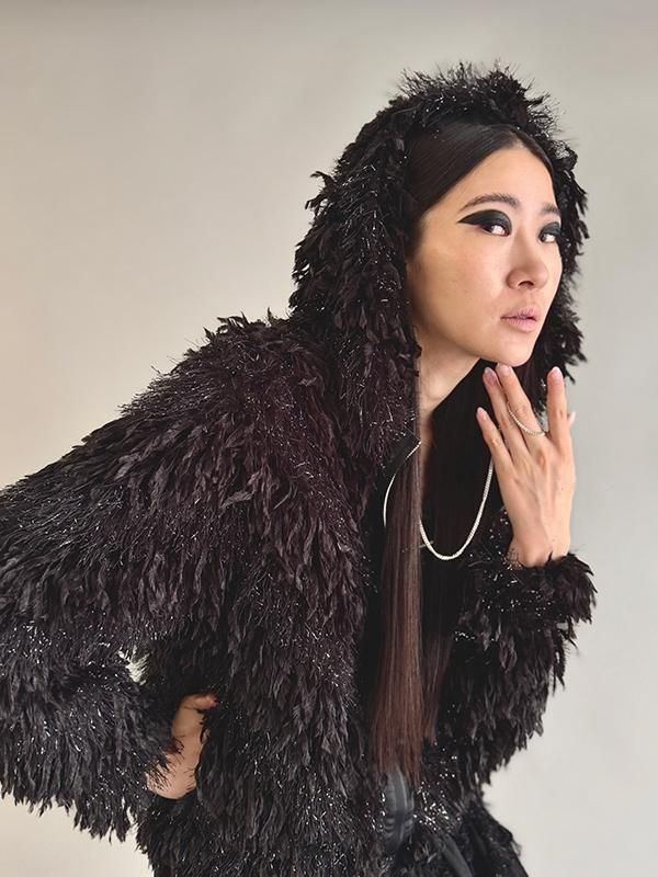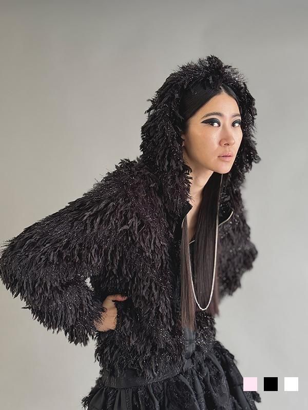 フェザーとメタル、シャギーと3種類の糸を組み合わせたふんわりとした毛足が上品な甘さを演出します。