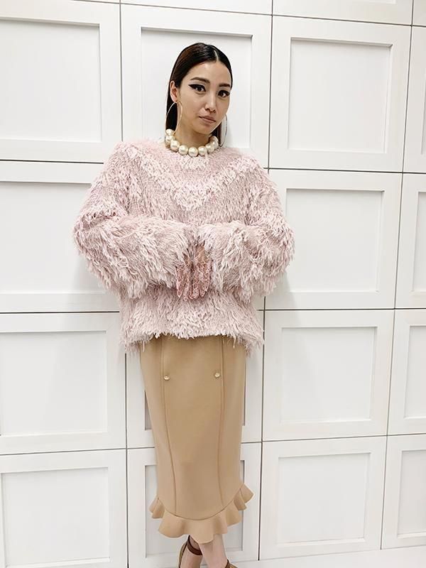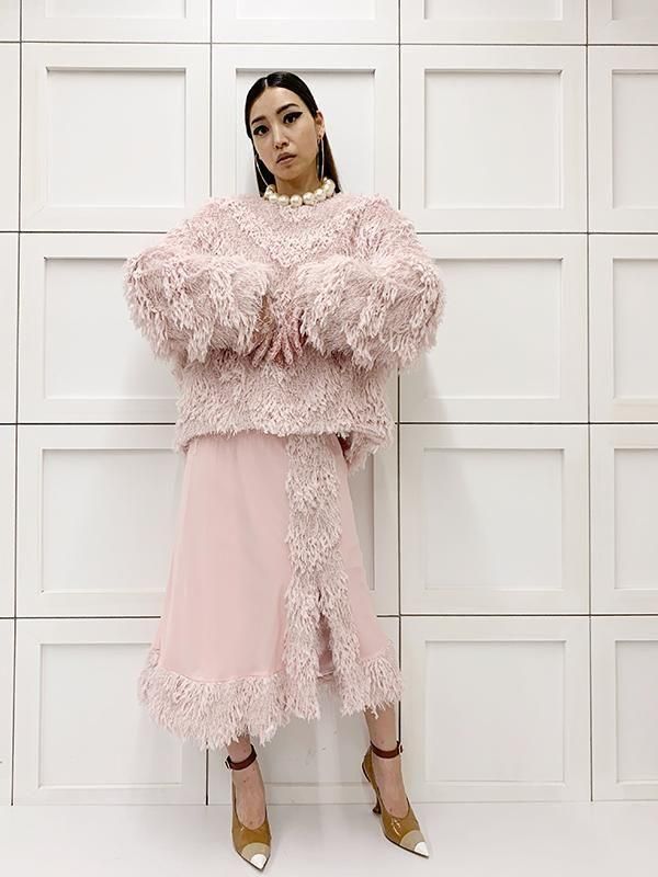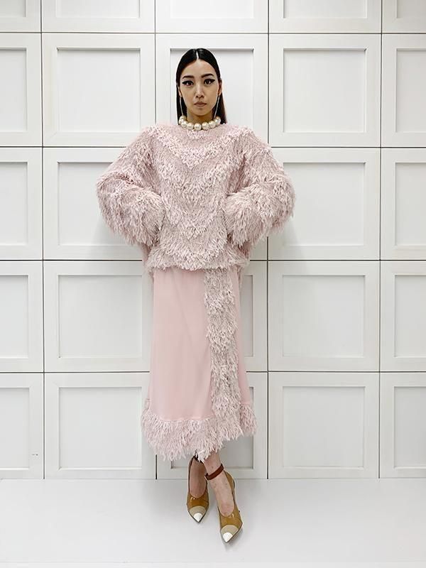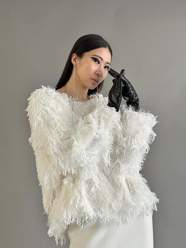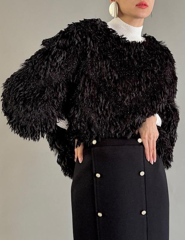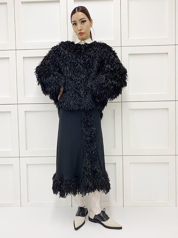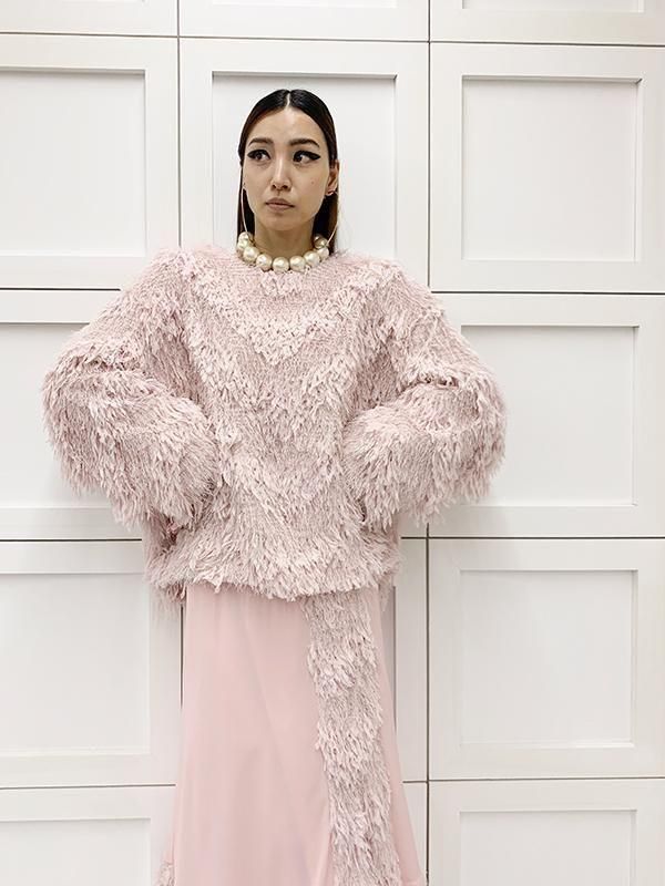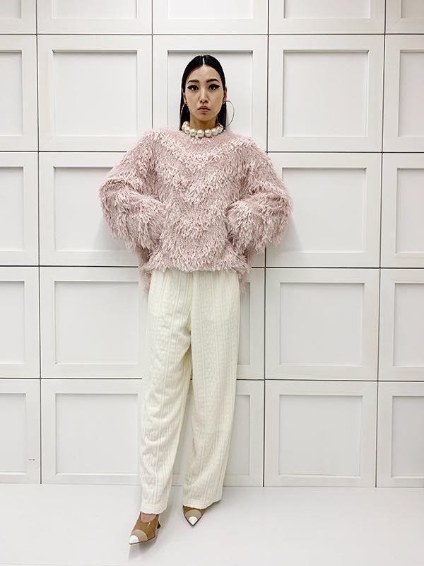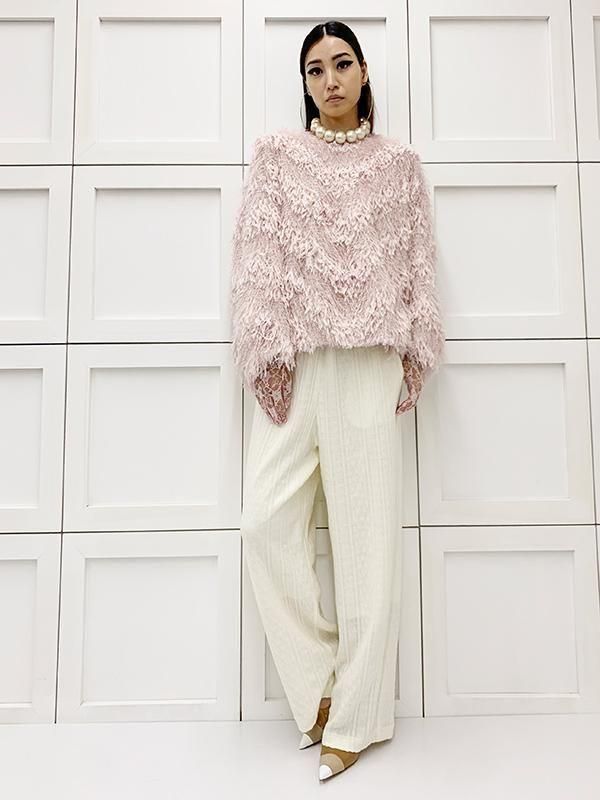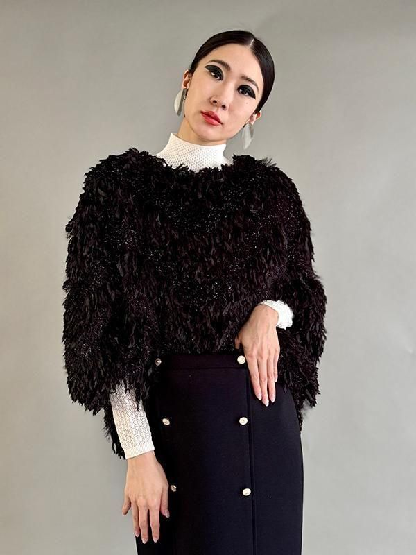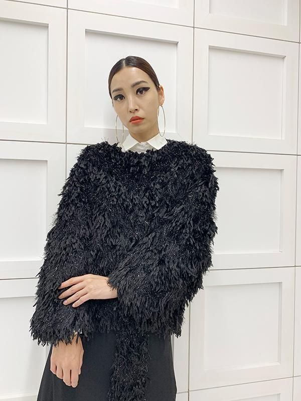 フェザーとメタル、シャギーと3種類の糸を組み合わせたふんわりとした毛足が上品な甘さを演出します。