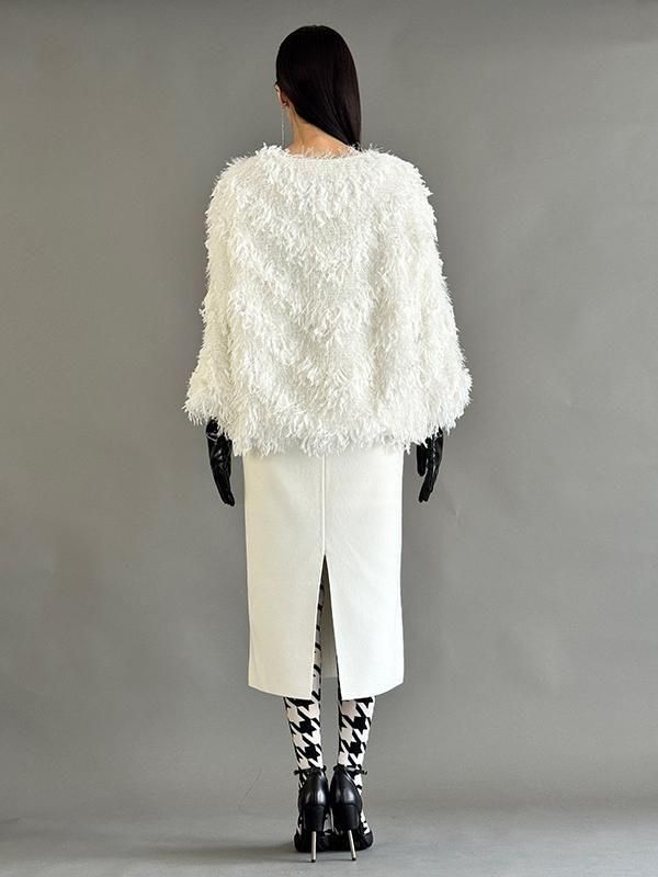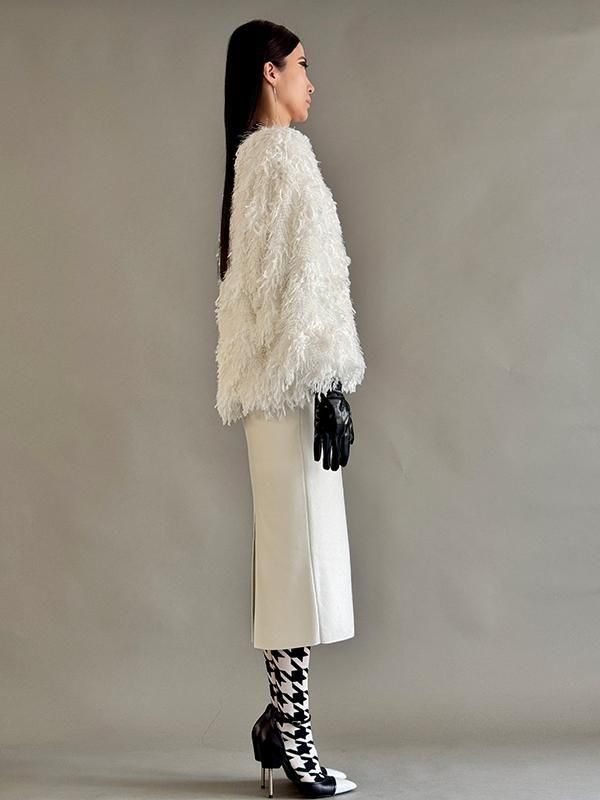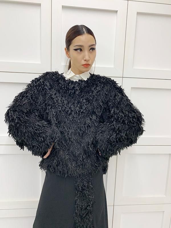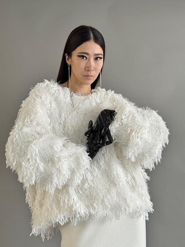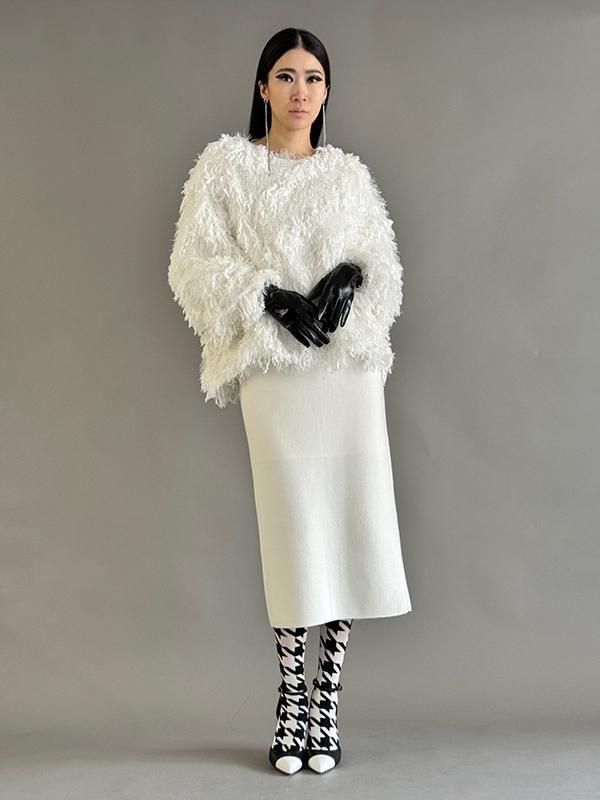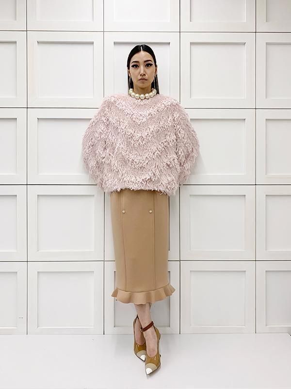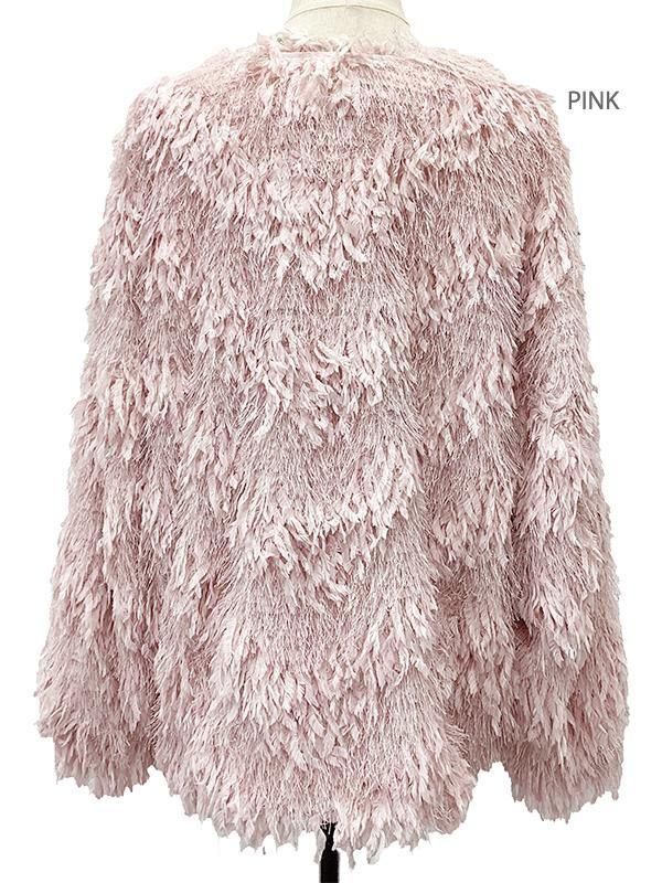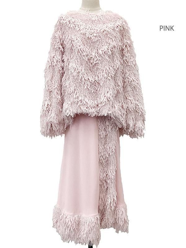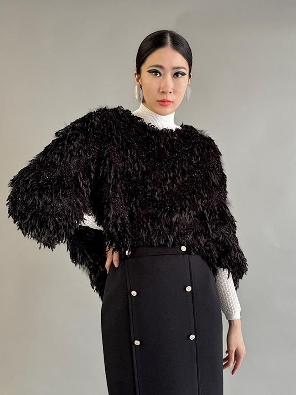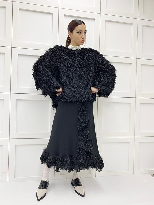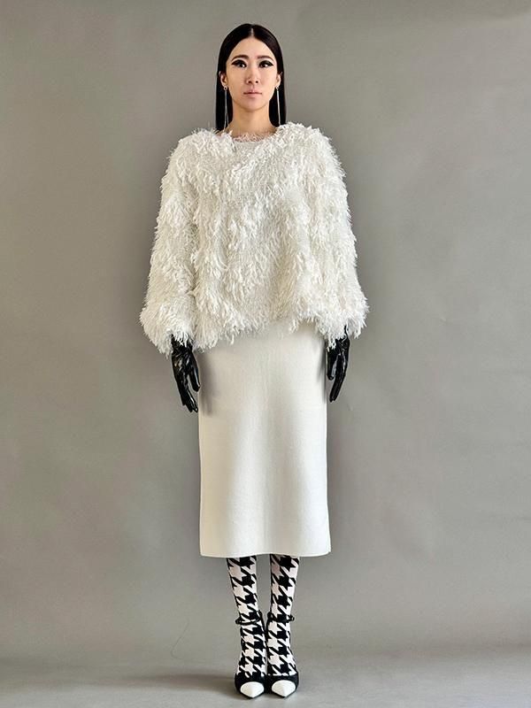 フェザーとメタル、シャギーと3種類の糸を組み合わせたふんわりとした毛足が上品な甘さを演出します。