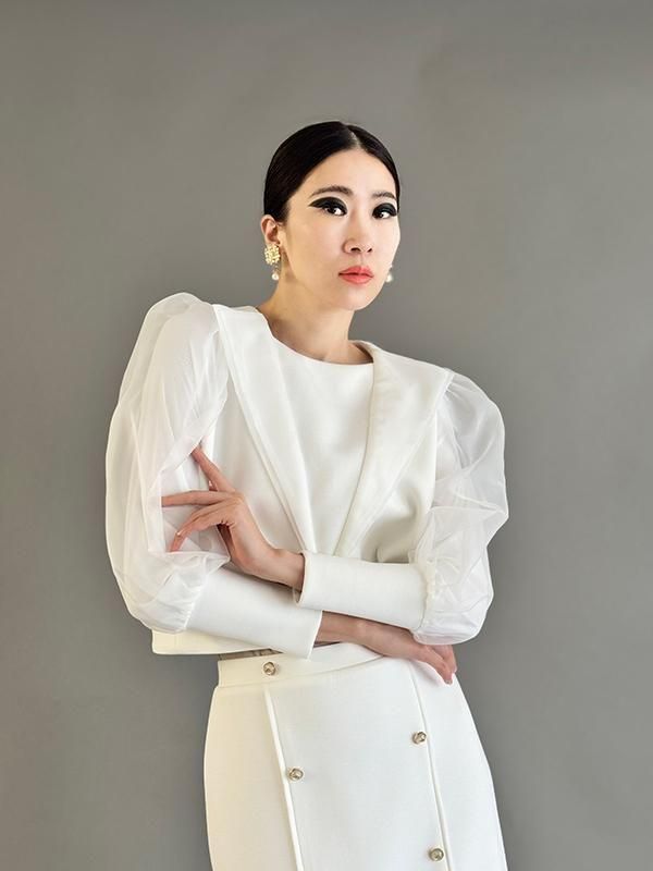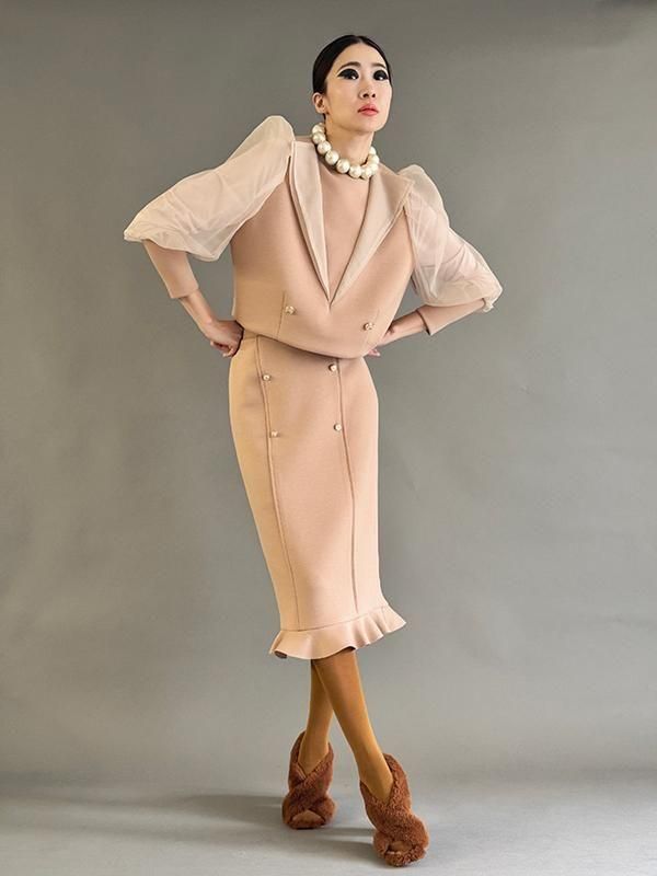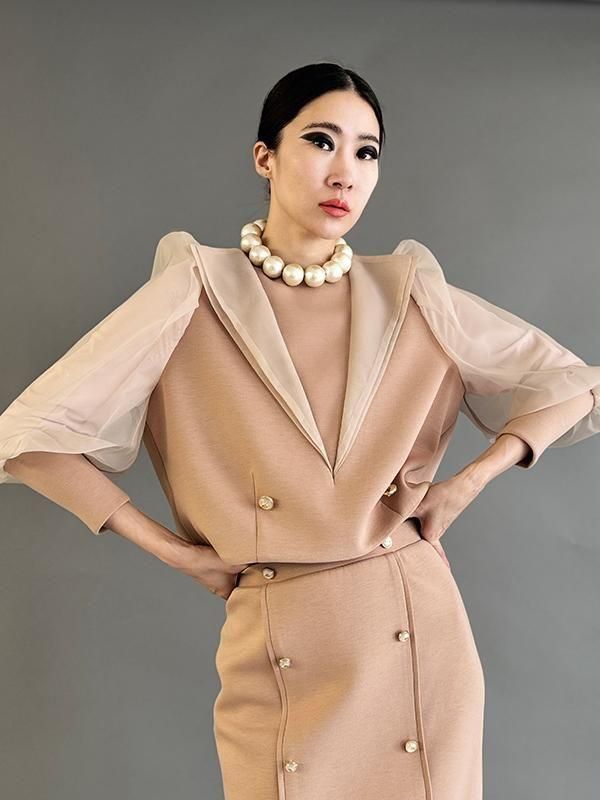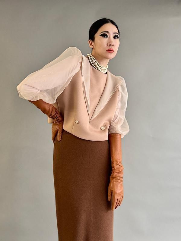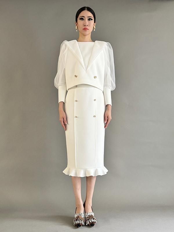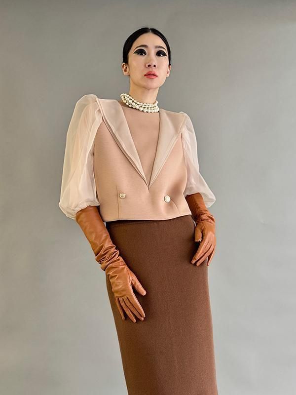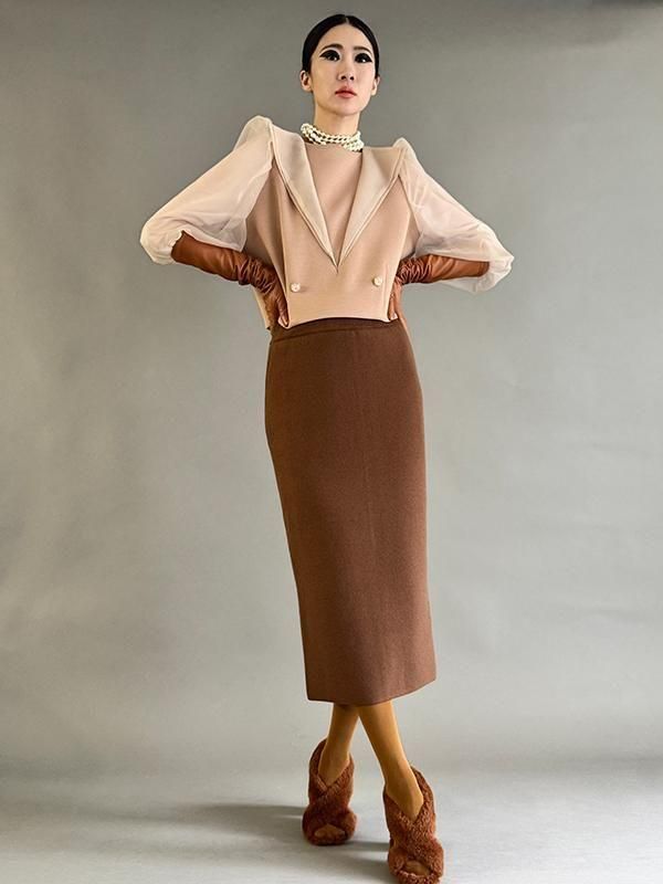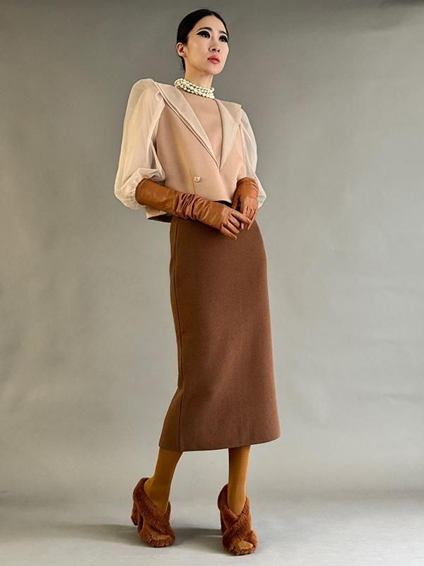 同シリーズのスカートとセットで着用すれば全身のバランスが美しくまとまります。