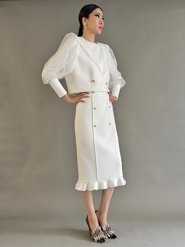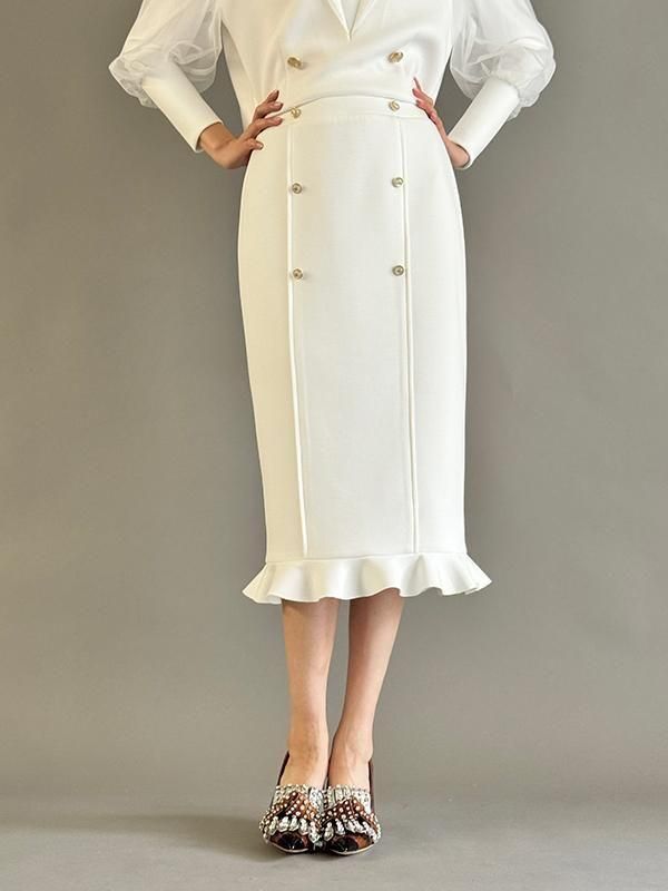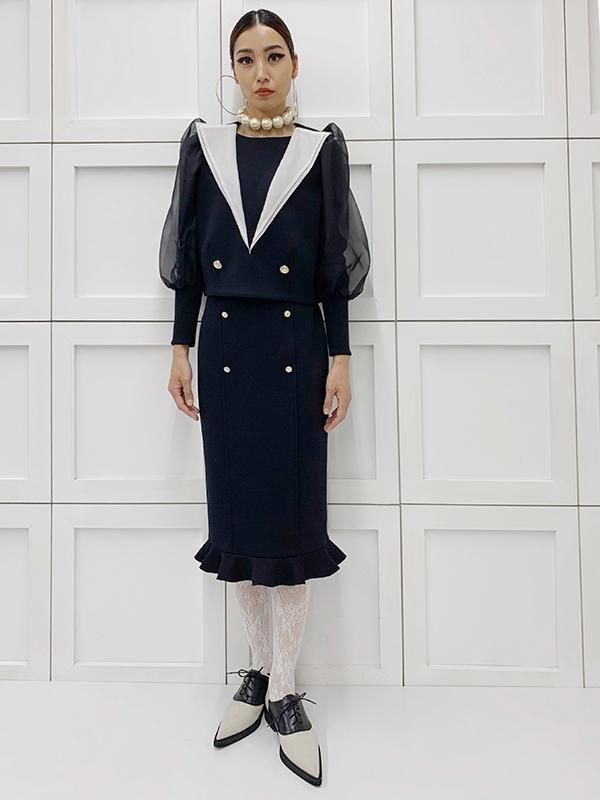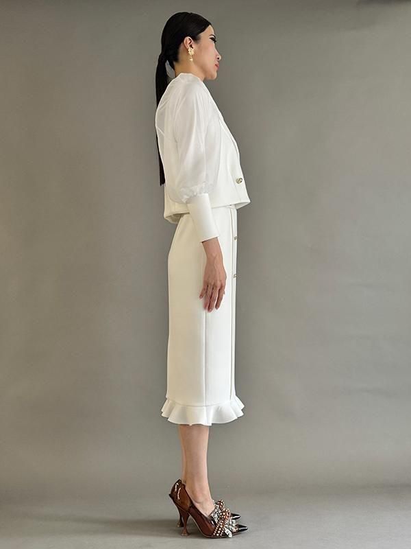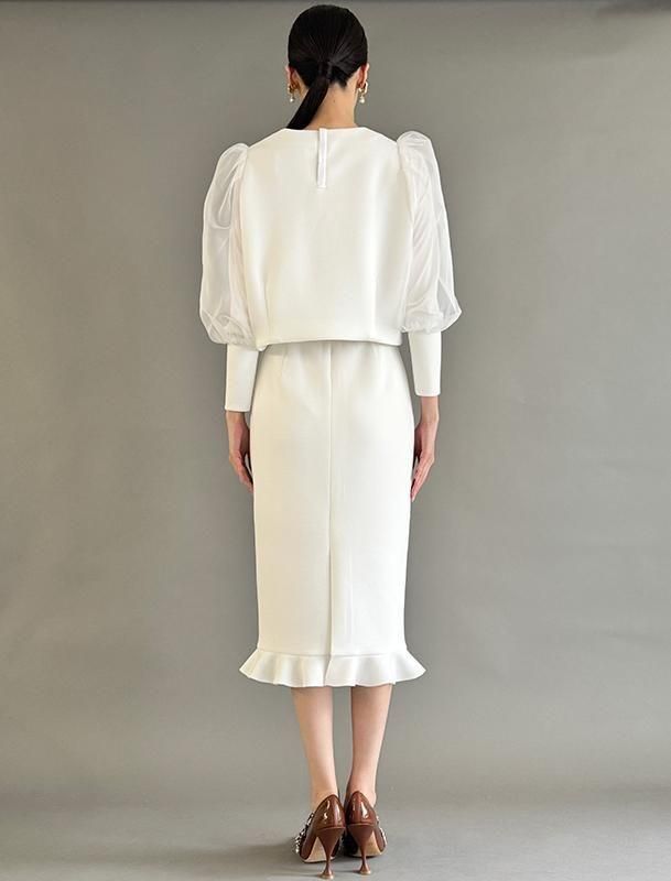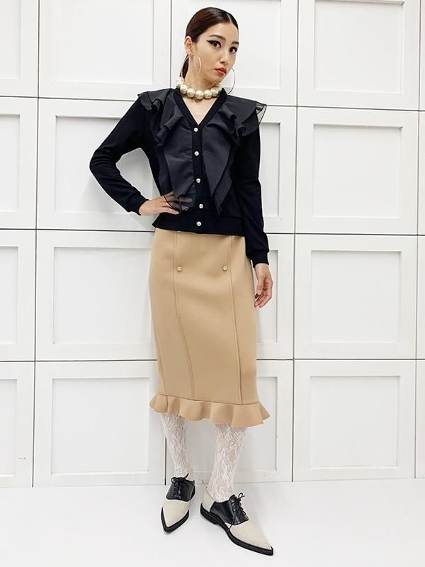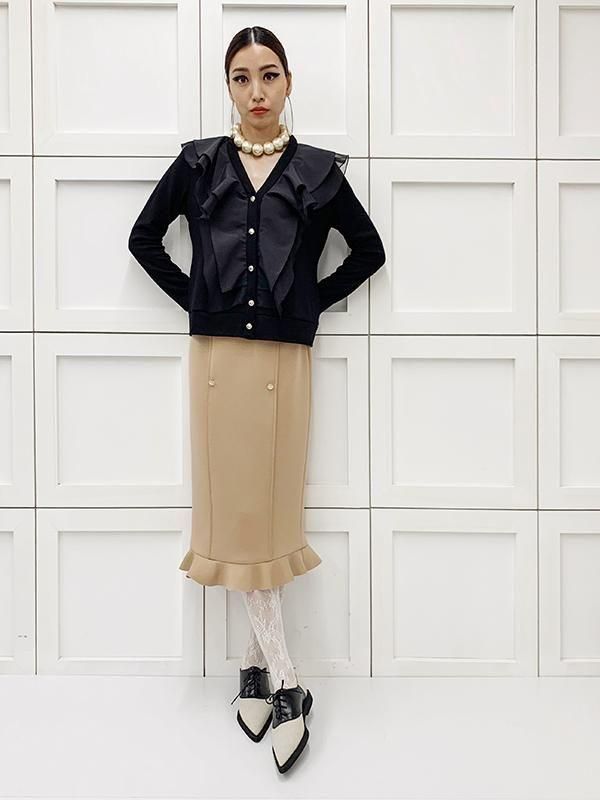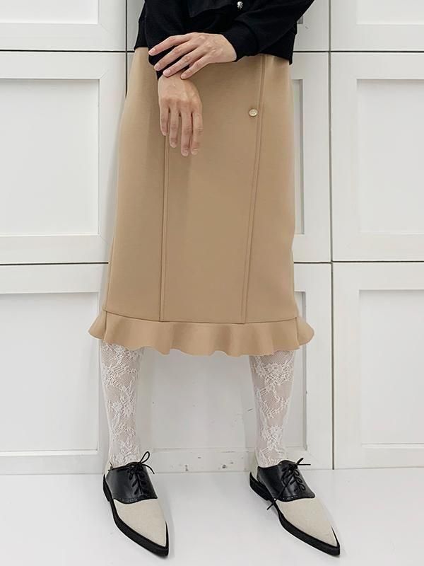 すっきりとしたIラインシルエットに、裾のフリルが主張しすぎずキュートでフェミニンな雰囲気に。