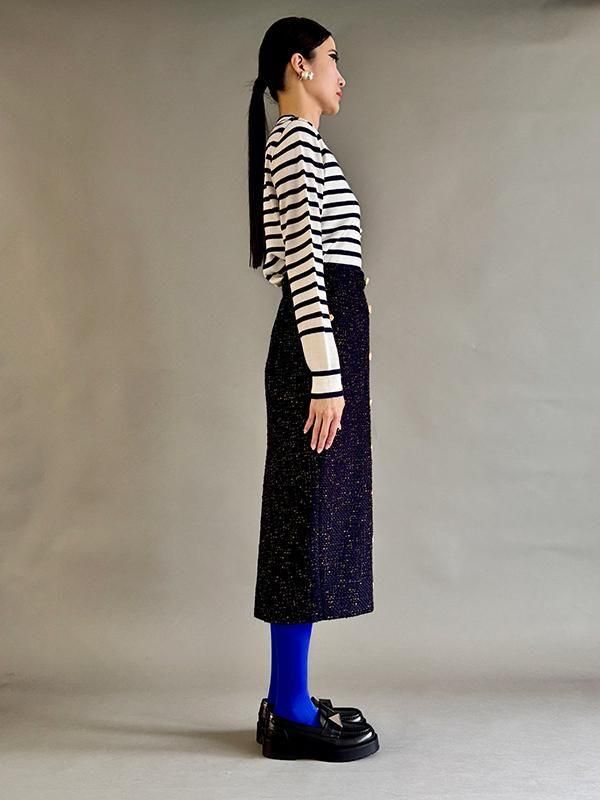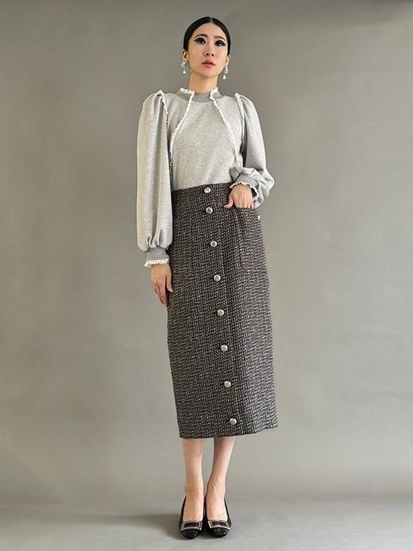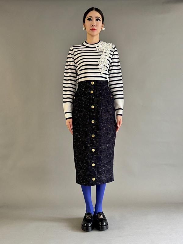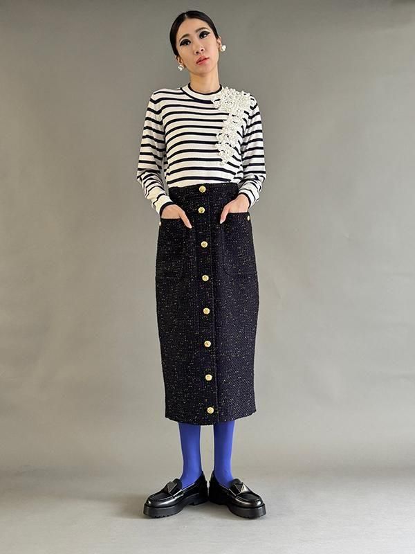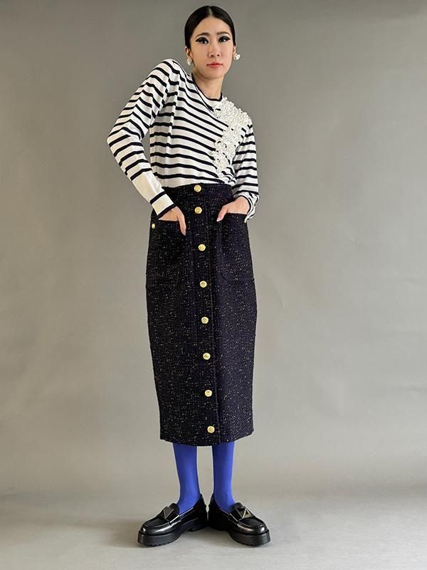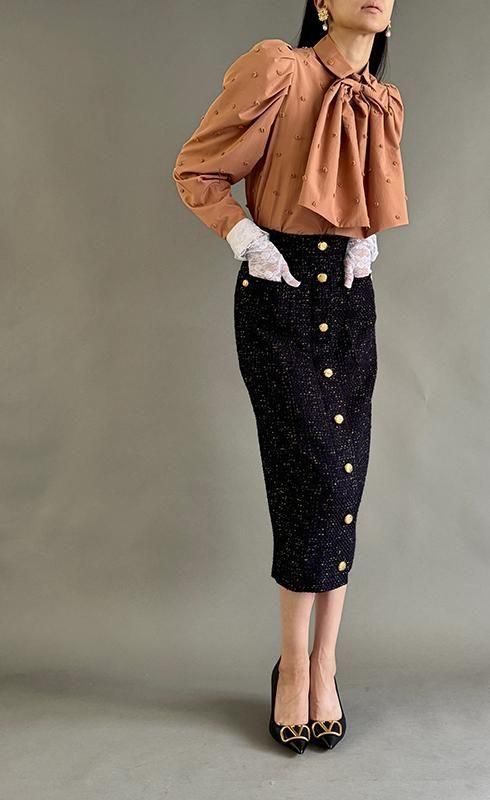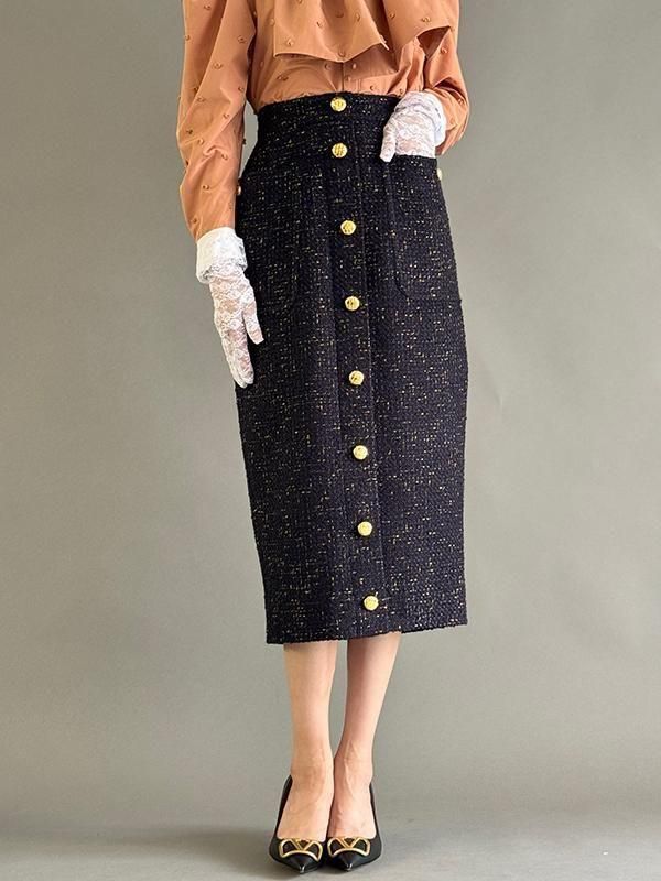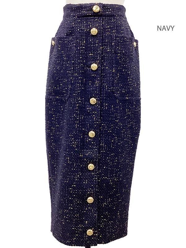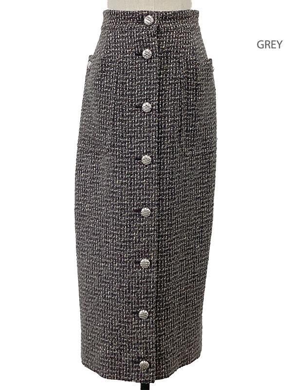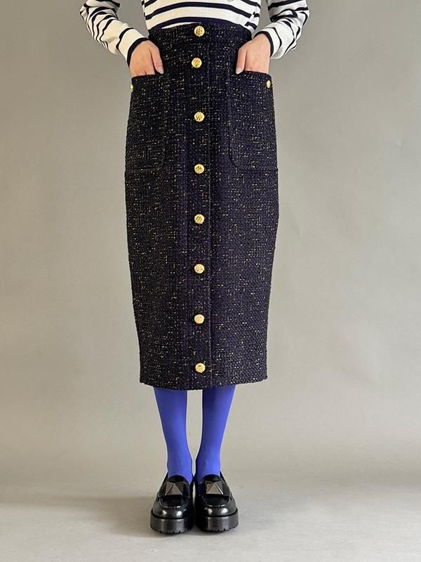 メタリックツィードにメタルボタンを組み合わせたフロントオープンのタイトスカートです。