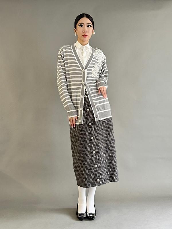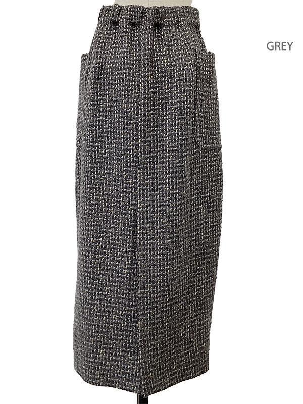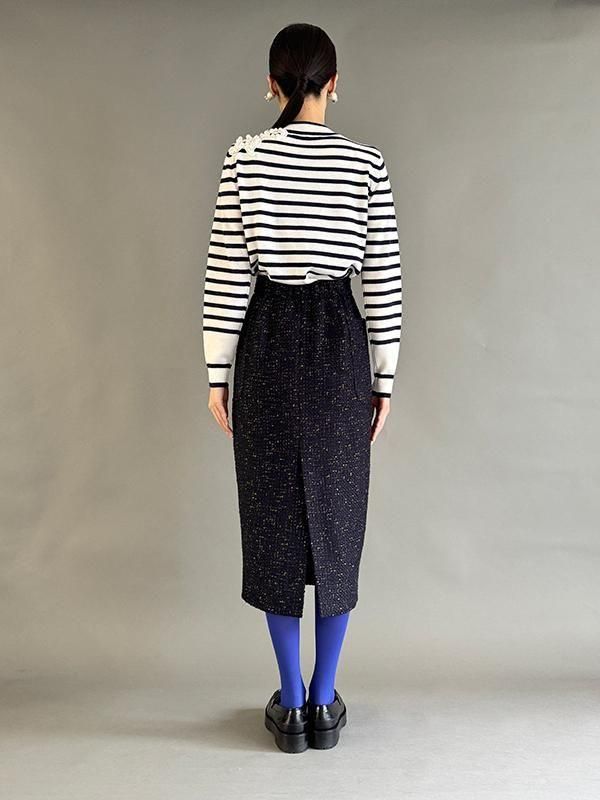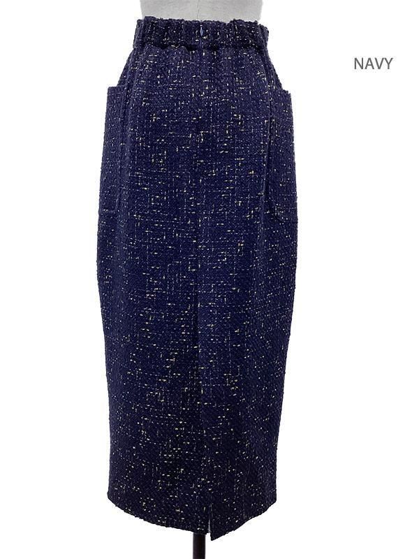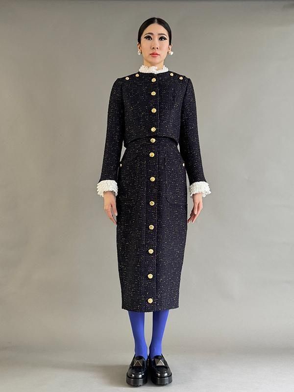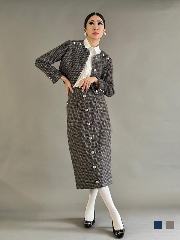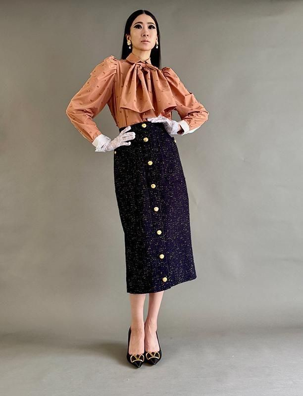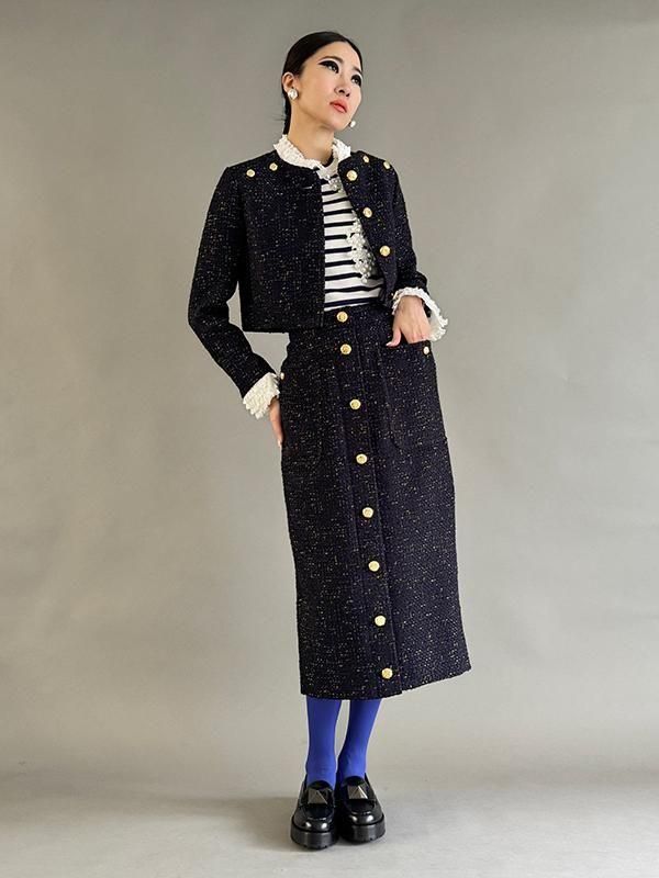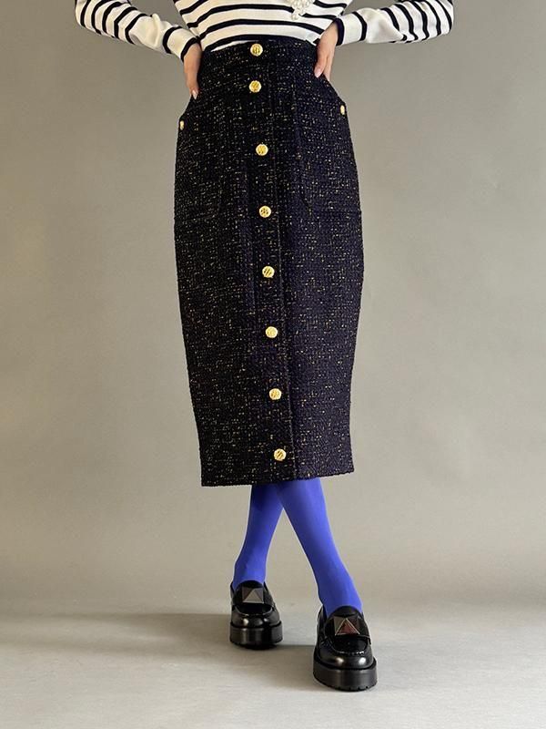 メタリックツィードにメタルボタンを組み合わせたフロントオープンのタイトスカートです。
